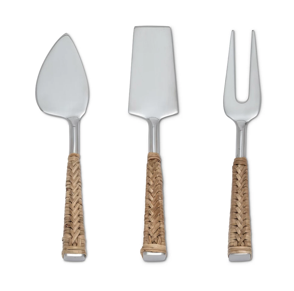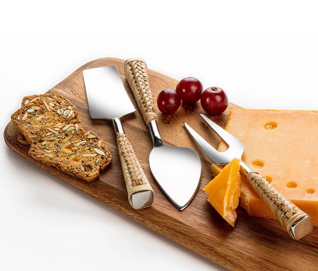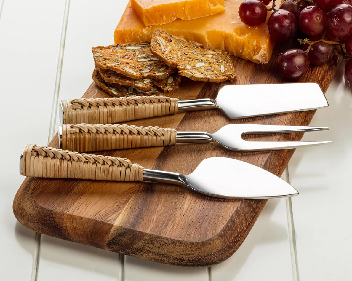 This set of three rattan-handled cheese knives makes a sophisticated complement to any cheese board. Made of stainless steel and natural cane, the minimal design of these three distinctive knives is perfect for serving up any style of cheese, from smooth to firm.Â