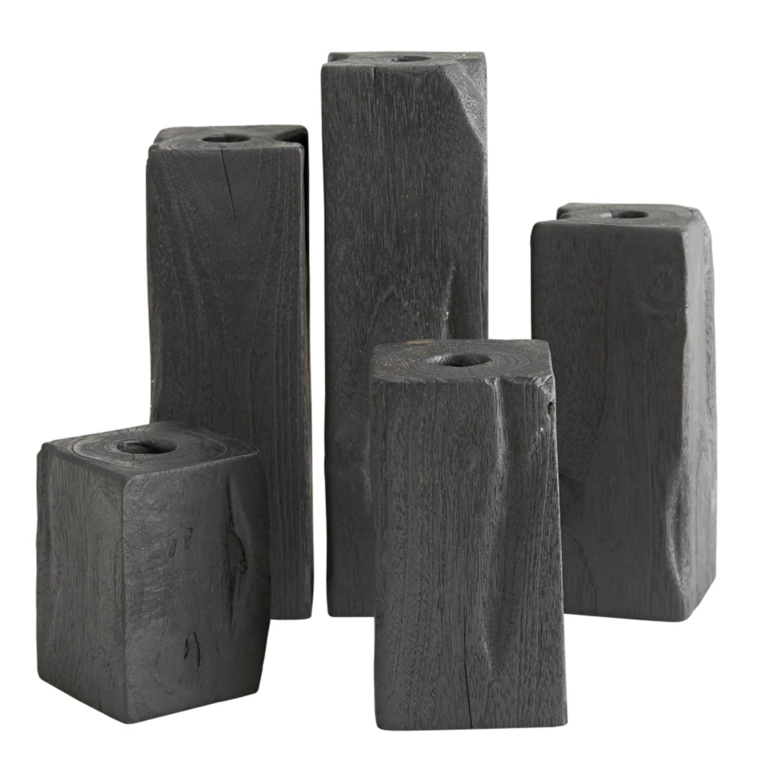 The Henlee collection raises the bar on designer candleholders. Teak root taper candleholders of varying heights are carved by hand, with a blackened ebony finish to enhance their natural aesthetic. Gather this set of five on the center of a dining table to create a staggering lightscape or break them up on shelves as sculptures.