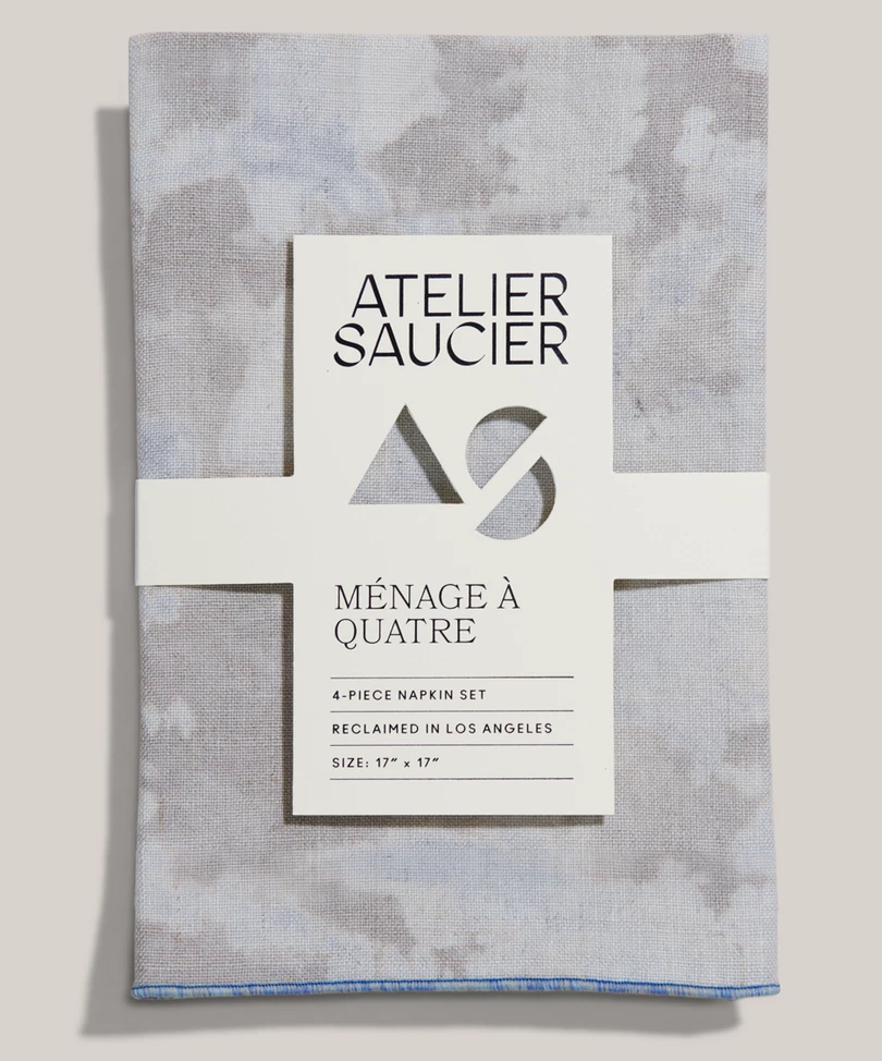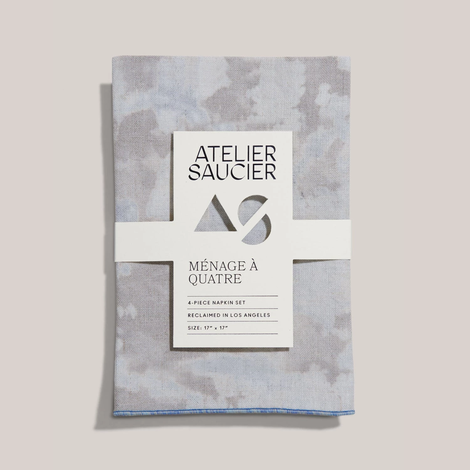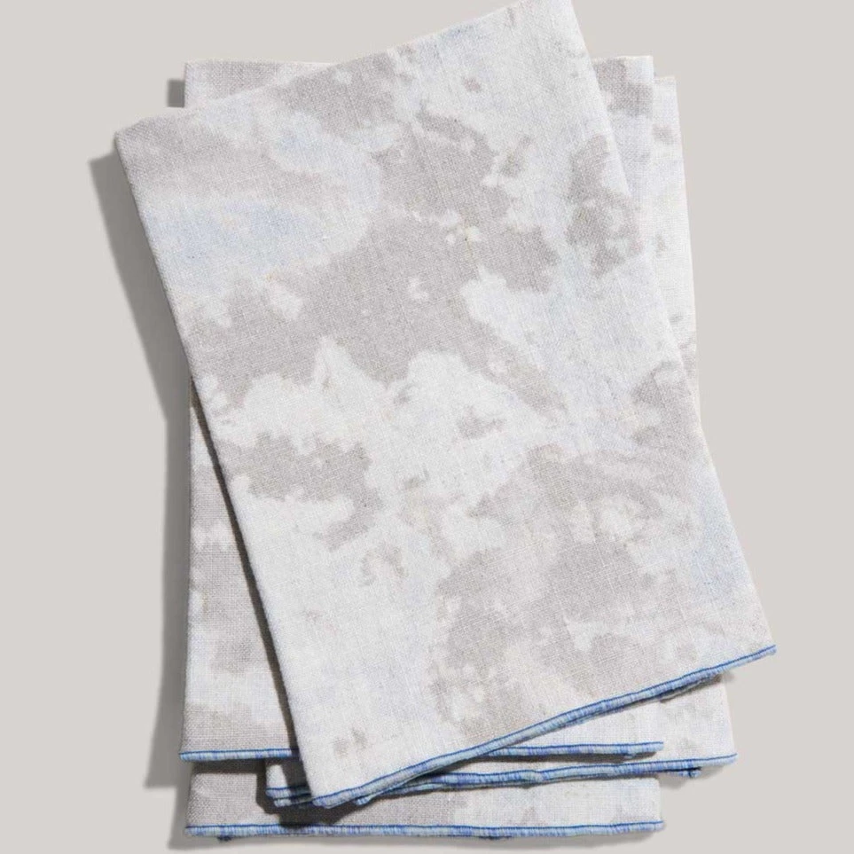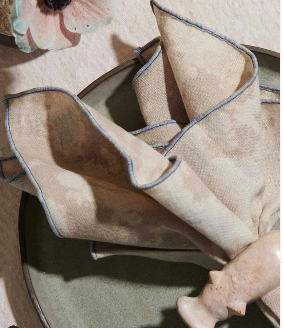 Our Blue Sky Linen is inspired by perfect day at the beach. Crafted with a reverse tie-dyed Oatmeal Linen base + bordered with cobalt, ocean blue, sky, and Cancun sand mixed threads.