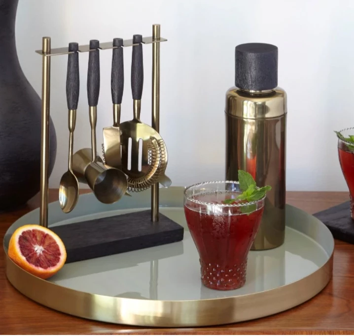 Shake things up with our sleek and sultry Aren Mango Wood Cocktail Shaker. This cocktail shaker boasts a darkened color palette a lid handcrafted from protected mango wood groves in India. Each aged bronze shaker is crafted by a pair of hands before finding itself in yours.