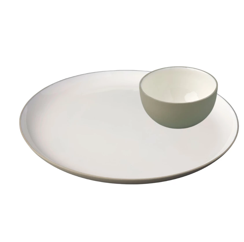 The platter has a modern design with and enamel inside and matte dove gray outside. Great for serving or add the matching mini bowl to create a wonderful platter for veggies and dips. Makes a great hostess gift. Mini bowl sold separately.