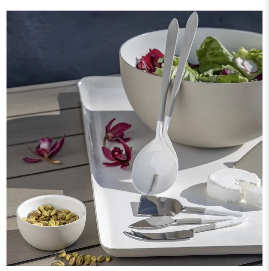 These modern salad servers have clean white enamel heads and dove gray handles. Pair servers with the matching bowls