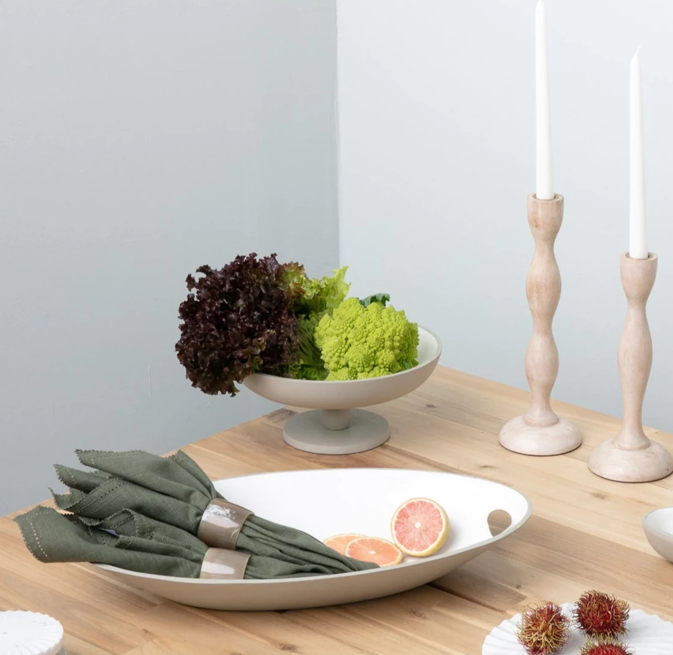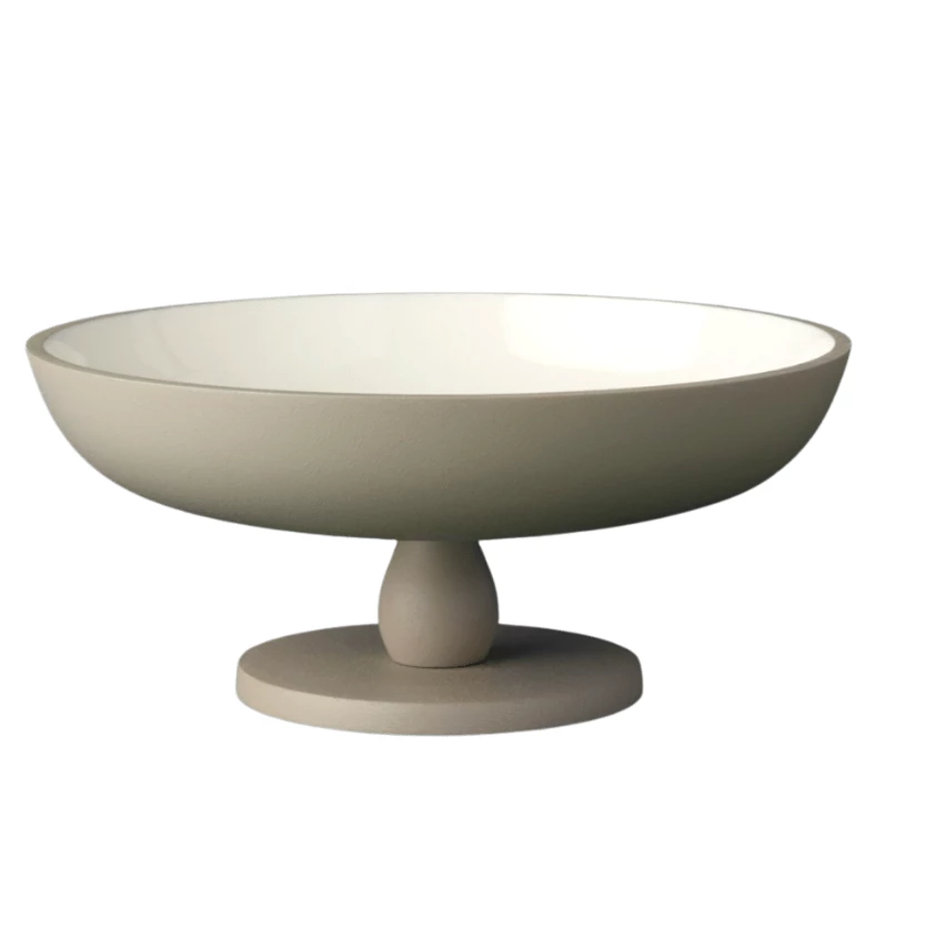 The footed bowl has a modern design with and enamel inside and matte dove gray outside. Great for serving or to put on an island with fruit. Pair with matching serving set, platter and bowls