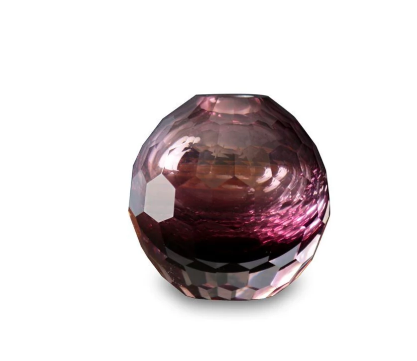 These faceted bud vases in amethyst are beautiful alone on a side table or as a collection with all three sizes.  The faceted glass is hand-cut by artisans and each piece catches the light and adds decorative sparkle wherever it is placed.