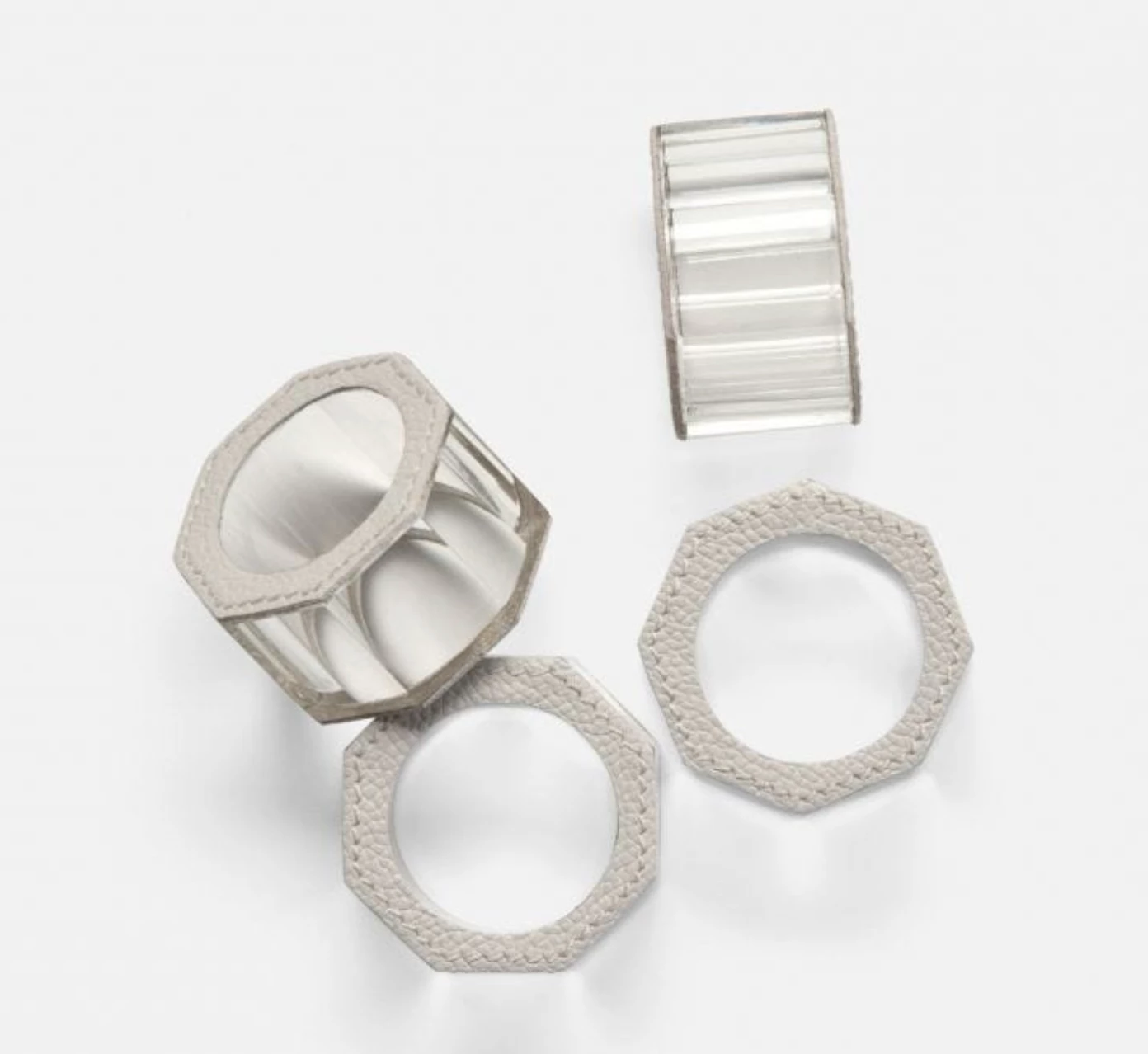 Sleek and sophisticated, these crystal napkin rings have a full grain leather edge detail. They can be dressed up or used casually. Variation to be expected.