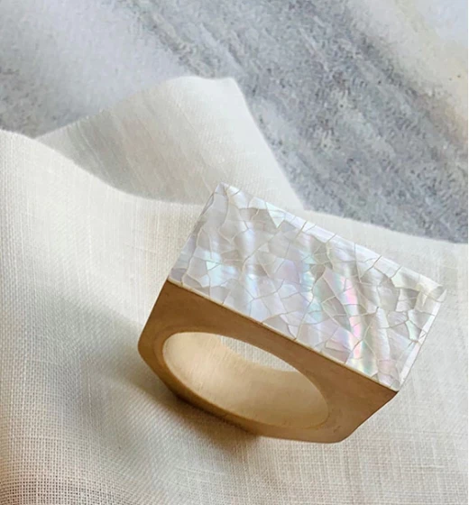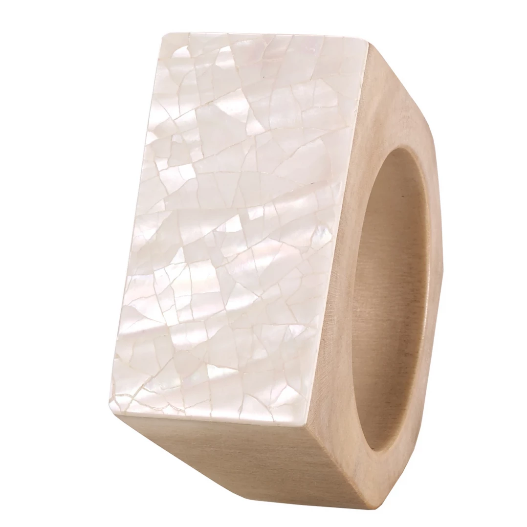 Cracked shells adorn the face of the modern shape wood napkin ring. The ring beautifully complements many table top designs and can be used day to night.Â