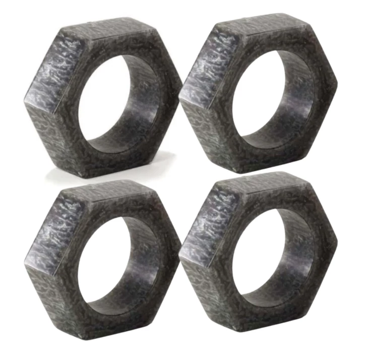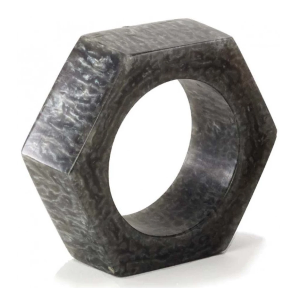 The modern design of the Piper napkin ring has a hexagonal shape and a marble finish in grey. A simple ring that works well on many napkins.