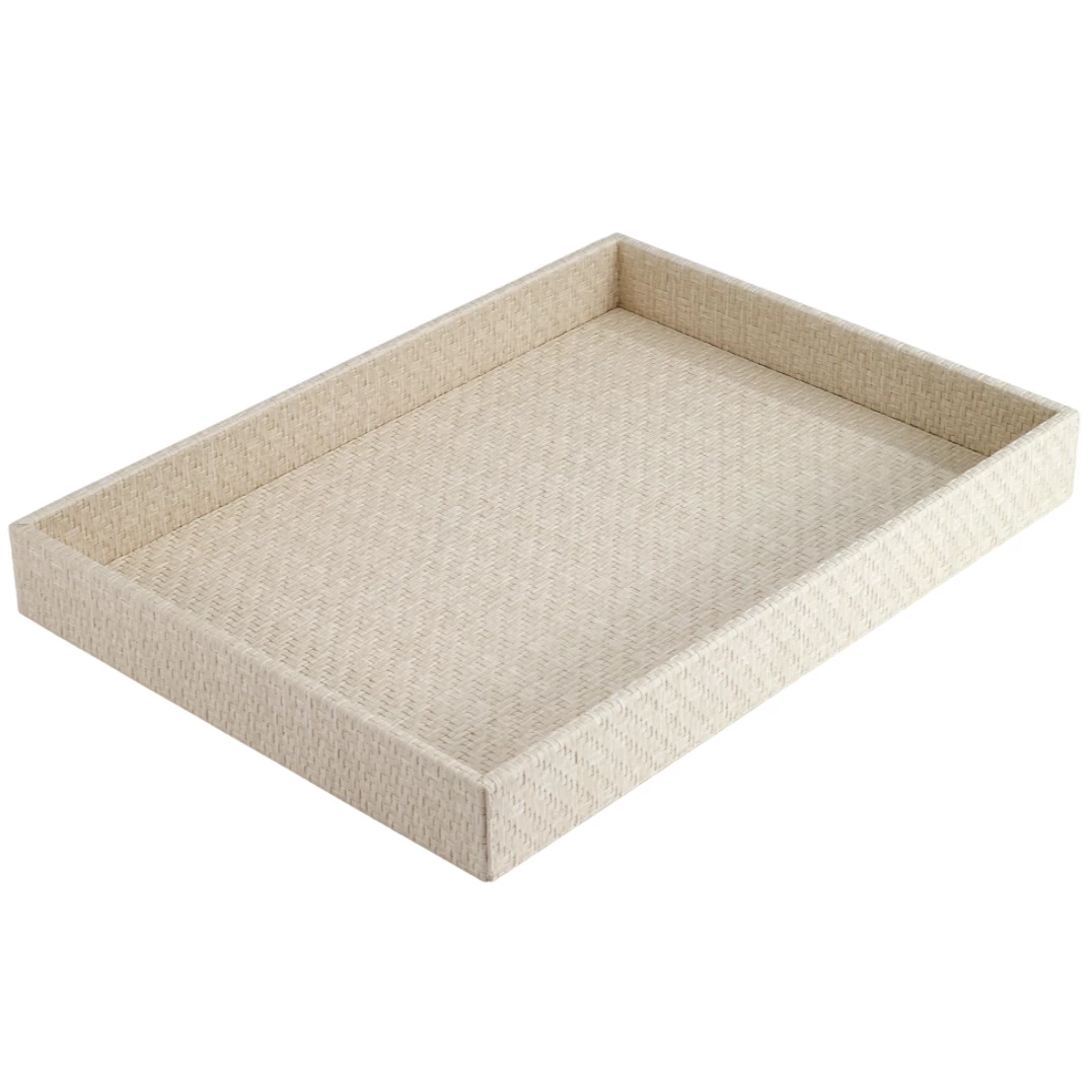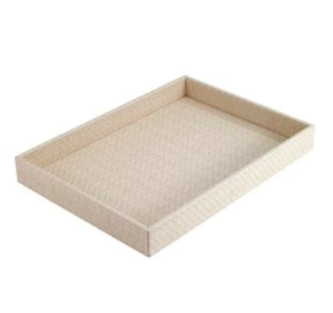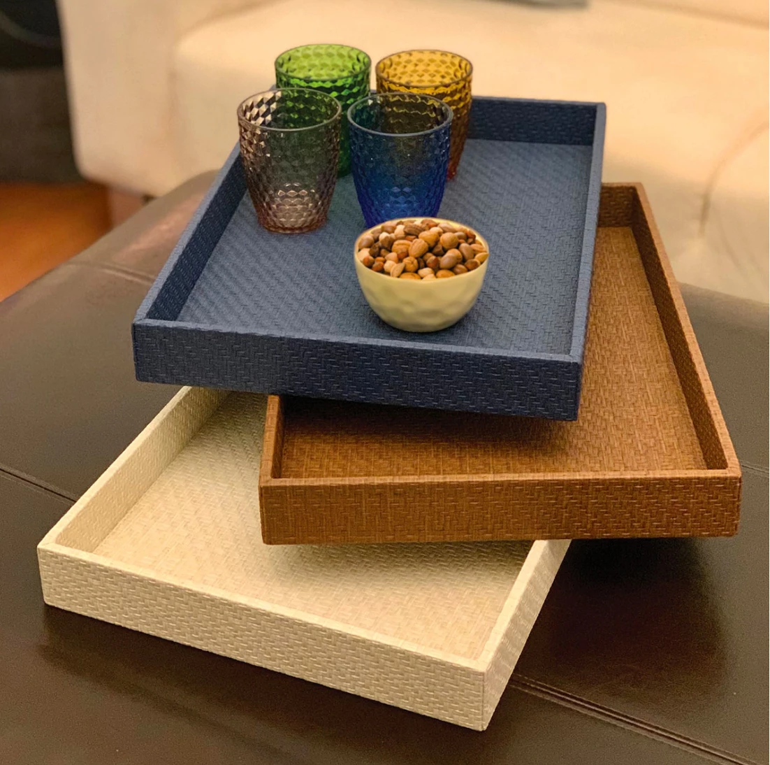 The wicker tray is our newest design. It has an intricate woven design, replicating the technique you see on wicker products and is great for decor or for serving. The easy care fabric protests the tray against many spills