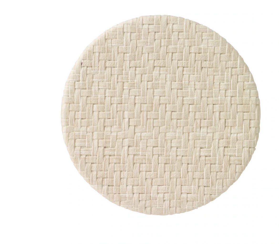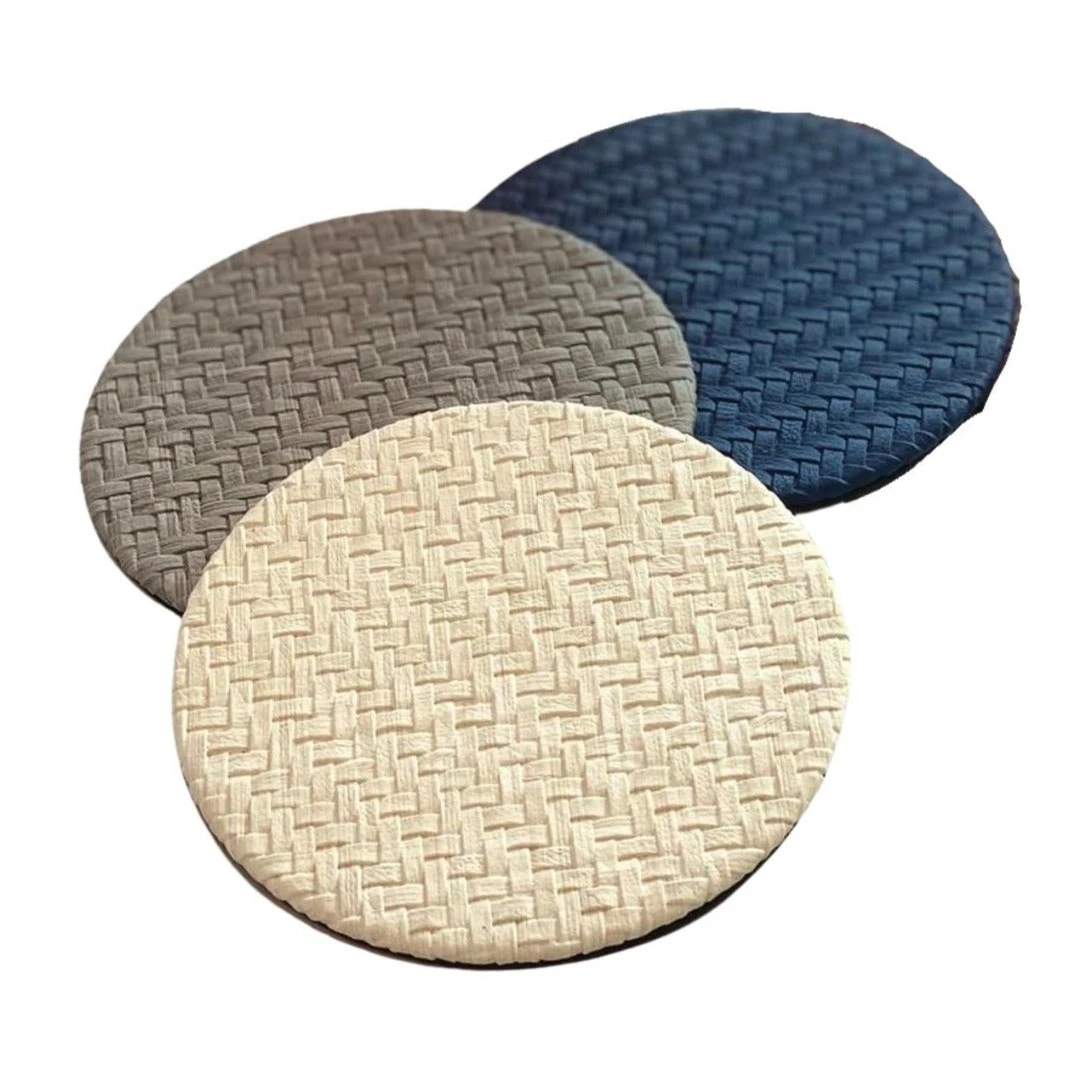 5″ round coasters backed with felt fabric. Available in 3 colors.