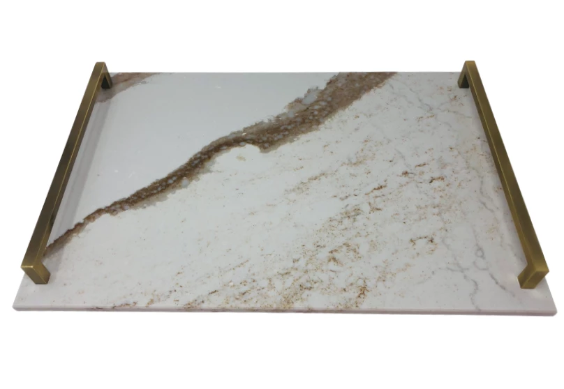 This chic cheeseboard has handles for easy serving. It makes a great board for cheese, sushi or as a layering piece for flowers or barware.
