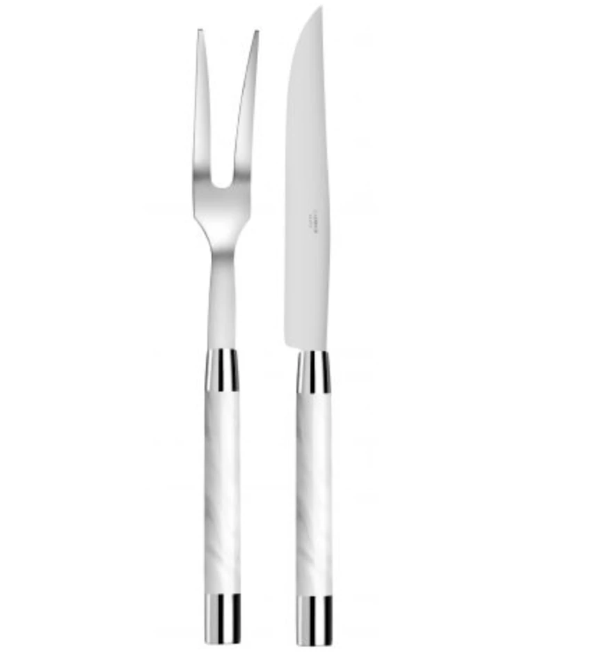 Made of the finest polished 18/10 stainless steel, this Carne Serving Set r has white acrylic handles that lend a modern touch to the table.