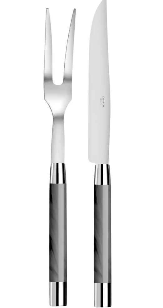 Made of the finest polished 18/10 stainless steel, this Carving Set with grey acrylic handles lends a modern touch to the table.Â