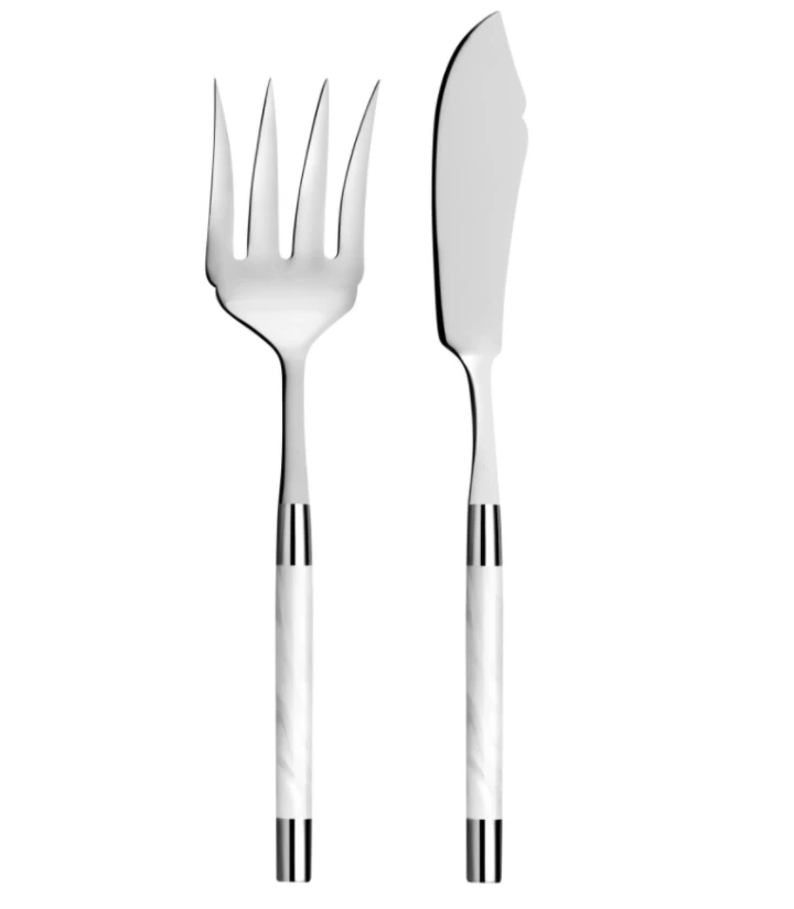 Made of the finest polished 18/10 stainless steel, this beautiful Fish Serving set has white acrylic handles that lend a modern touch to the table.Â