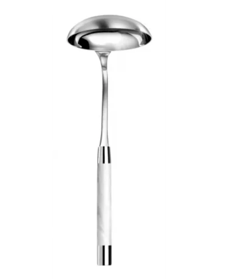 Made of the finest polished 18/10 stainless steel, this large Soup Ladle is great for the holidays and has a white acrylic handle that lends a modern touch to the table.Â