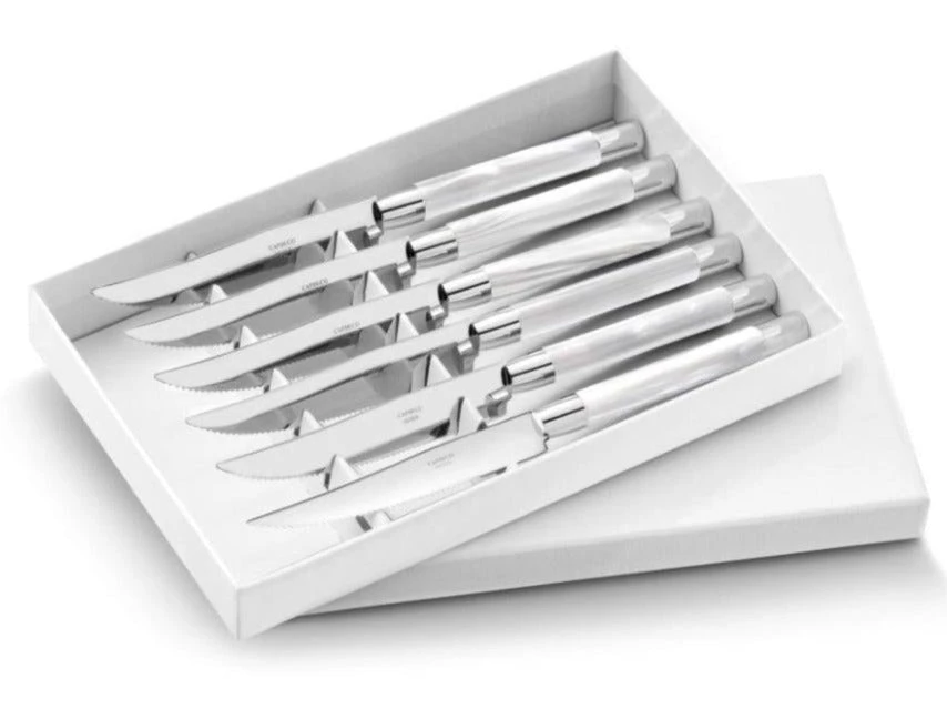 The Steak Knife Set can complement many table settings. Made of the finest polished 18/10 stainless steel they have a white acrylic handles that lends a modern touch to the table andÂ