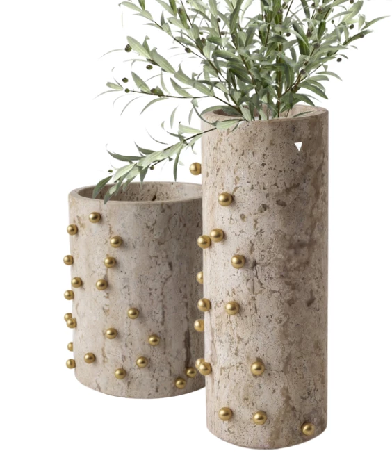 These travertine pieces are functional art pieces made with a design in brass studs. They are wonderful examples of artisanal craftsmanship handmade by expert artisans in Mexico. The pieces have been sealed and are watertight to hold flowers