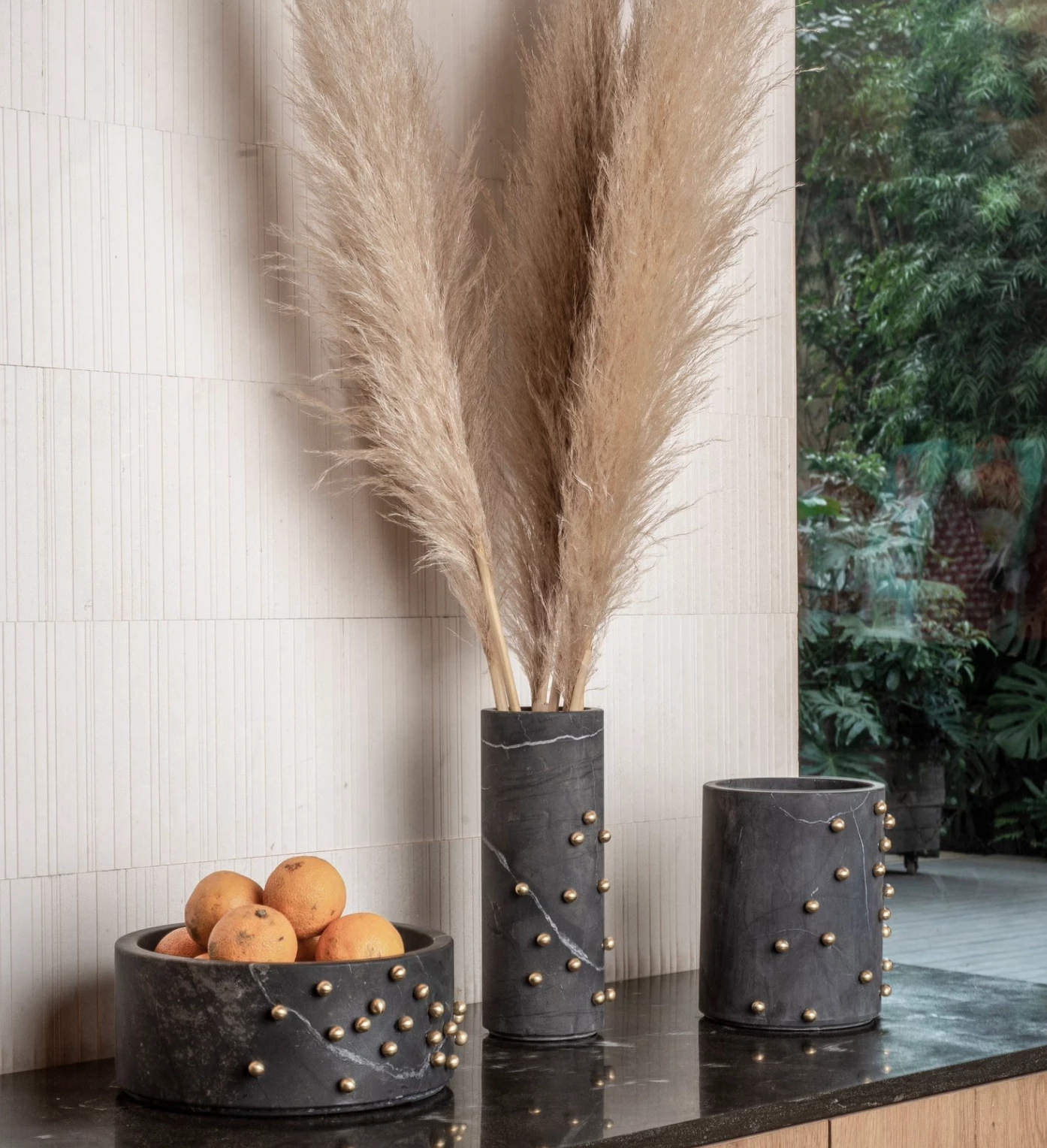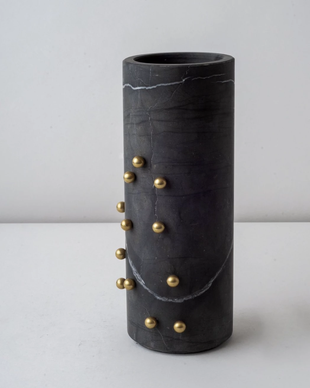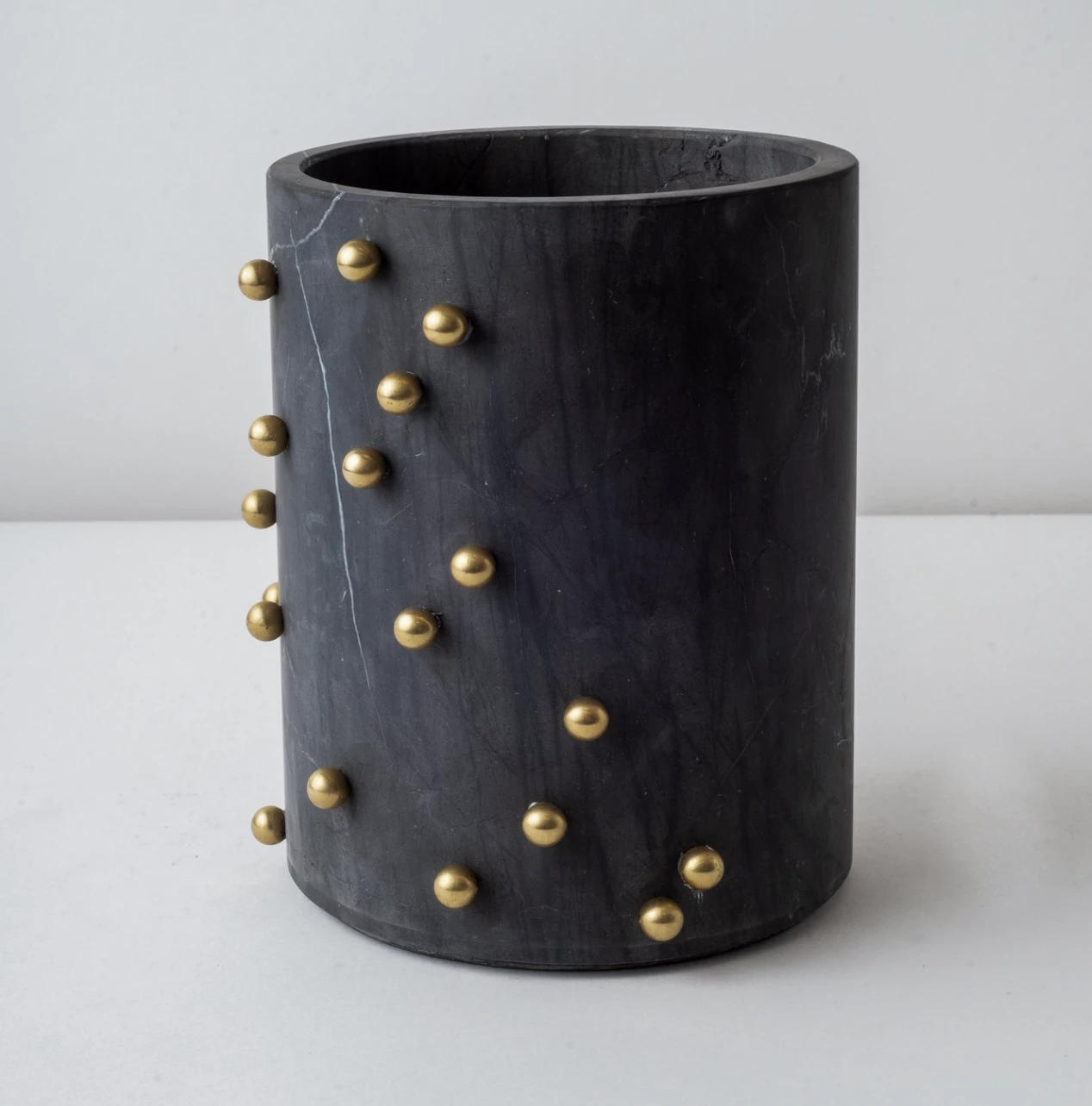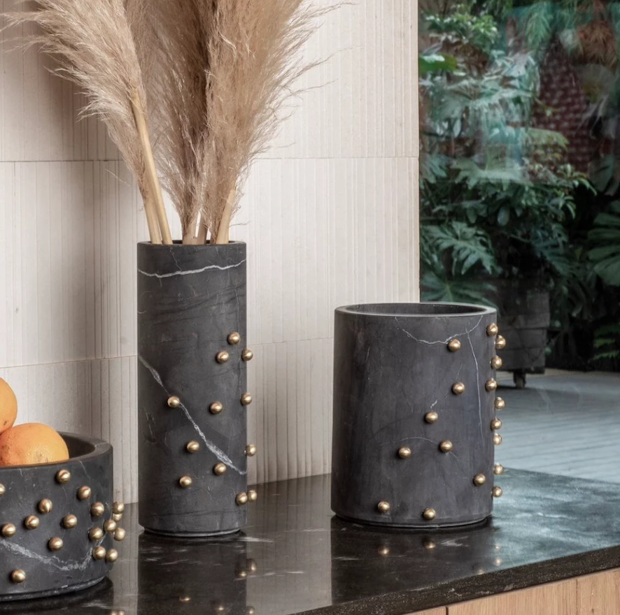 These Marble pieces are functional art pieces made with a design in brass studs. They are wonderful examples of artisanal craftsmanship handmade by expert artisans in Mexico. The pieces have been sealed and are watertight to hold flowers
