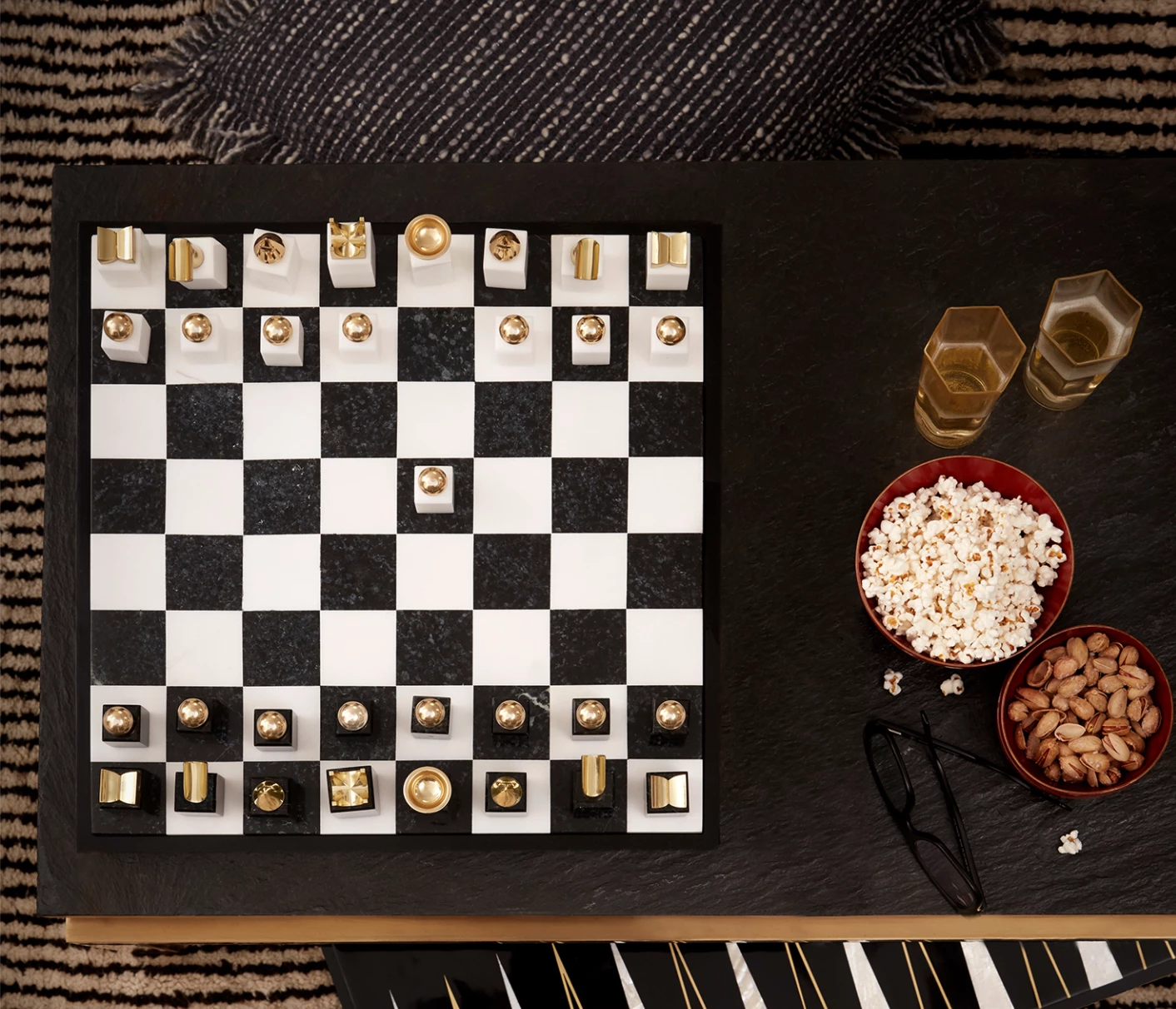 A thoughtful combination of fine textures and finishes, this Chess Set expresses the more playful side of L’Objet. Marble and brass chess pieces are abstract interpretations of the iconic movable objects.