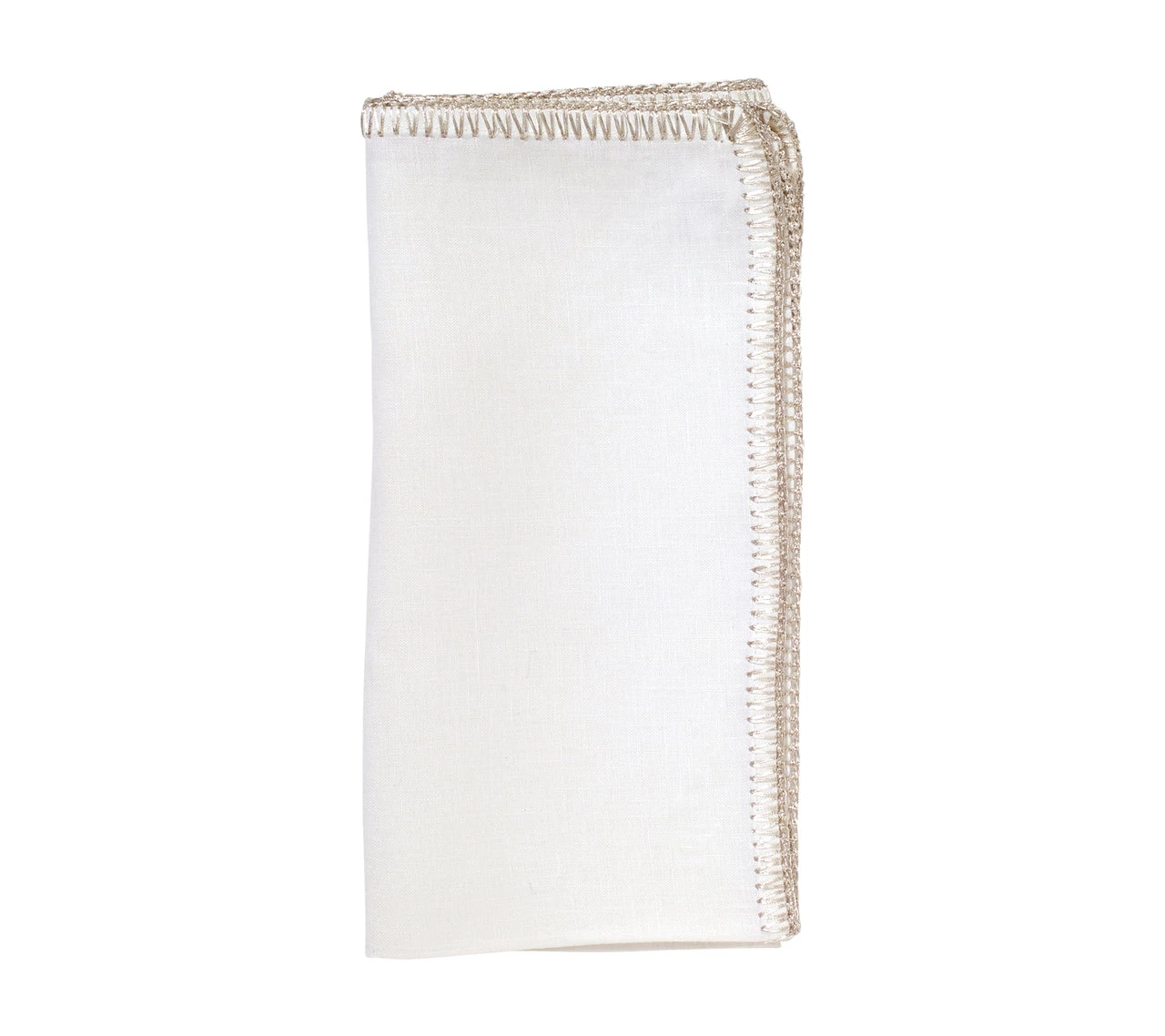 The white linen Crochet Edge Napkin by Kim Seybert features a crisp cloth napkin with an intricate silver crochet edge. With its simple but elegant design is easy  ready to be opened and used at every opportunity. The perfect white linen napkin for a classic, sophisticated table at a dinner party or holiday table.