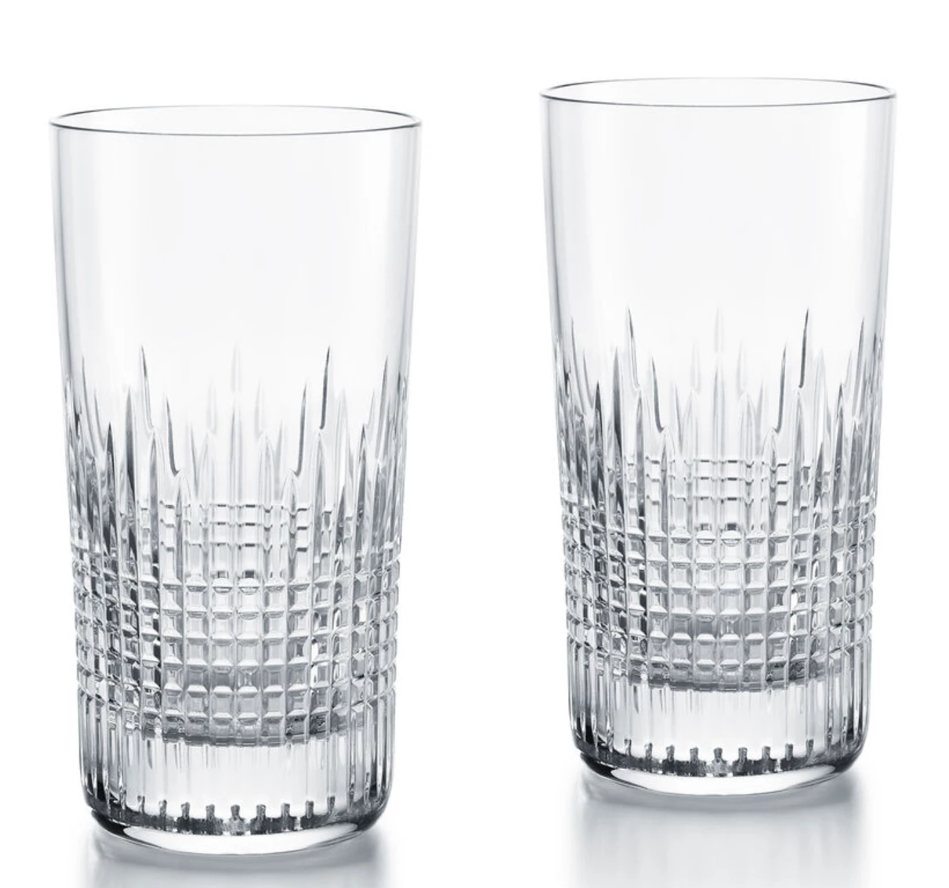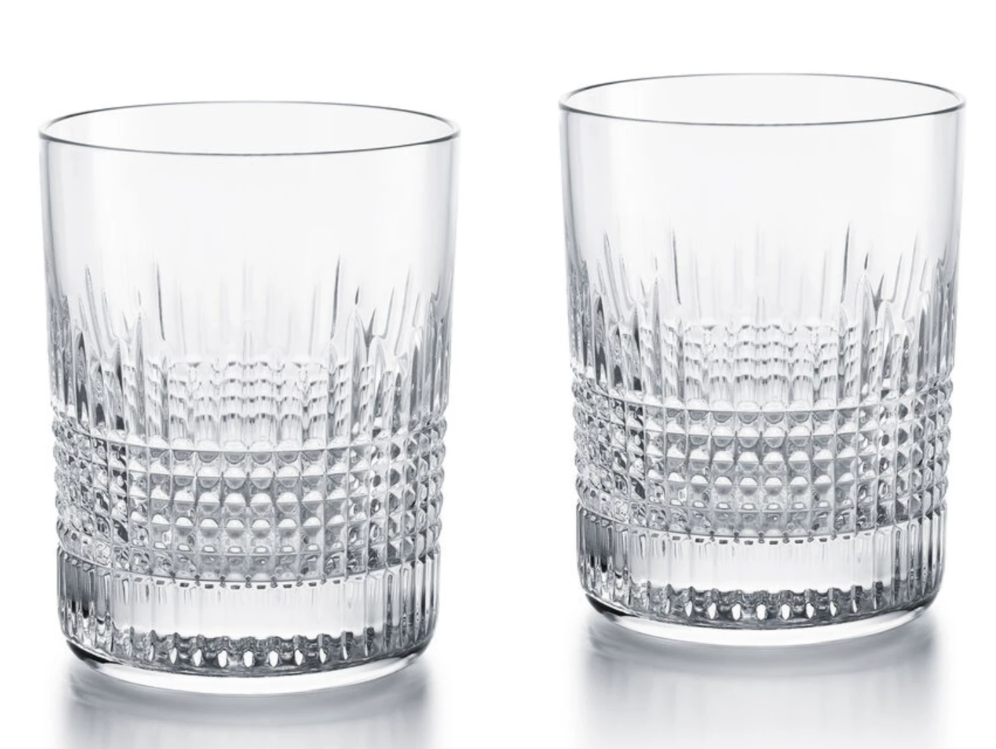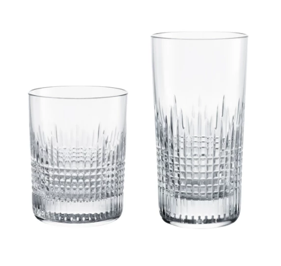 The rigorous geometry of the latticework offsets the smoothness of the upper part of the glass. The embossed clear crystal gives great depth and shimmer to the spirit within as the crystal catches the light. The textural feeling of the tumbler’s diamond-cut pattern against the fingertips underlines the craftsmanship applied to the Baccarat Clear crystal. The Nancy collection fully engages both the visual and tactile senses, and is a wonderful addition to a well-stocked bar.