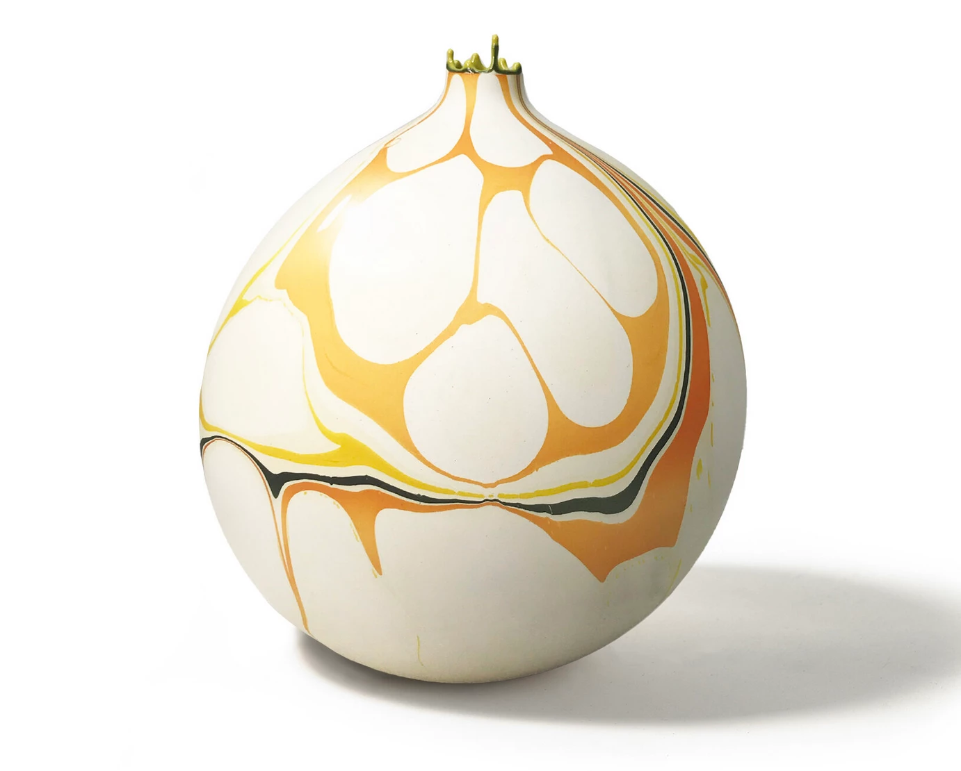 THE SATURATED VEINING RUNS ACROSS THE MUTED BACKGROUND. EACH VESSEL IS HAND-CAST WITH HYRDROCAL PASTER INSIDE OF A UNIQUE BALLOON SHAPE. THE INTERIOR IS POURED WITH LAYERS OF RESIN< MAKING IT WATERPROOF. FINISHED WITH A UNIQUE PIGMENTING PROCESS BASED OFF THE CONCEPT OF MARBLING PAPER, EACH VESSEL IS SEAL WITH A UV RESISTANT ACRYLIC COATING