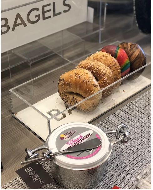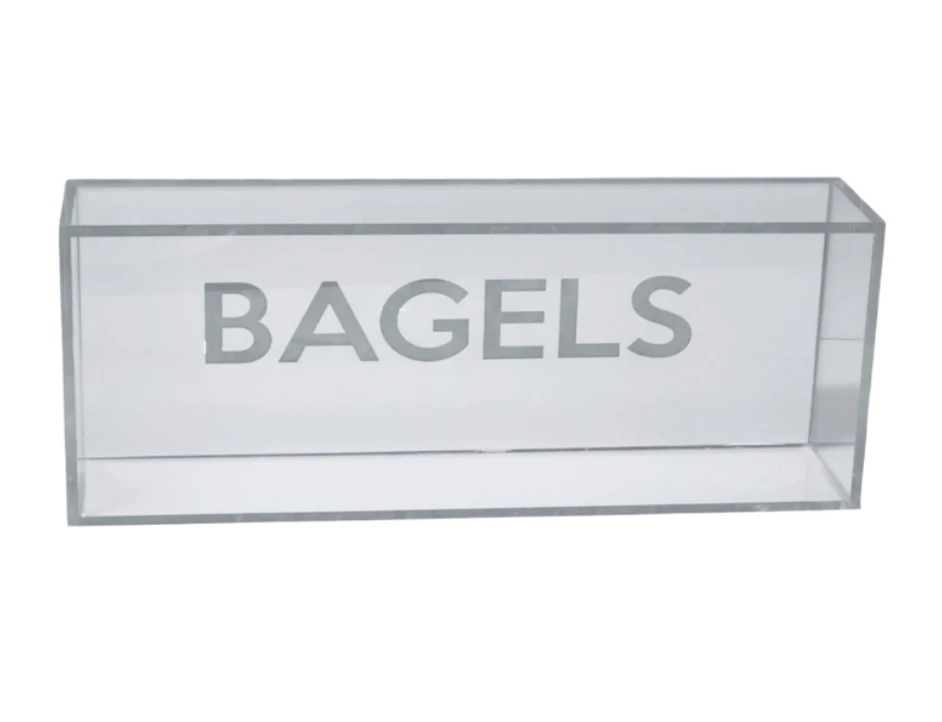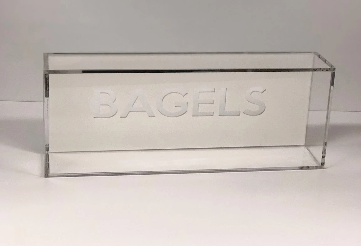 The word BAGELS comes through the white background in silver marble acrylic and this item makes a wonderful great gift.