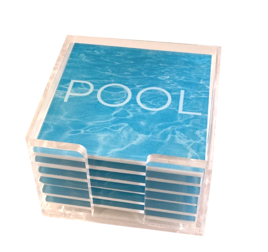 These coasters have a fun pool design and the word POOL on each coaster. The set includes six coasters in a modern acrylic holder easy to bring outdoors.