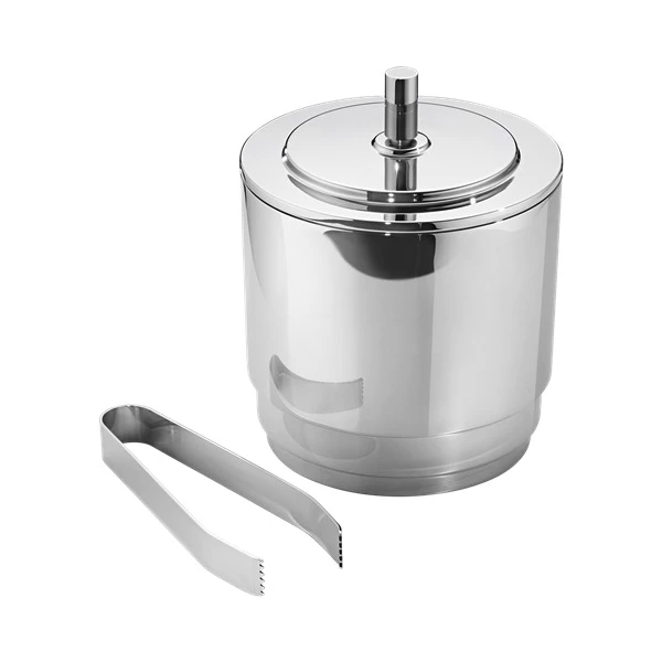 Ice bucket and tong set crafted of mirror-polished stainless steel detailed with a ridged base and lid by Georg Jensen