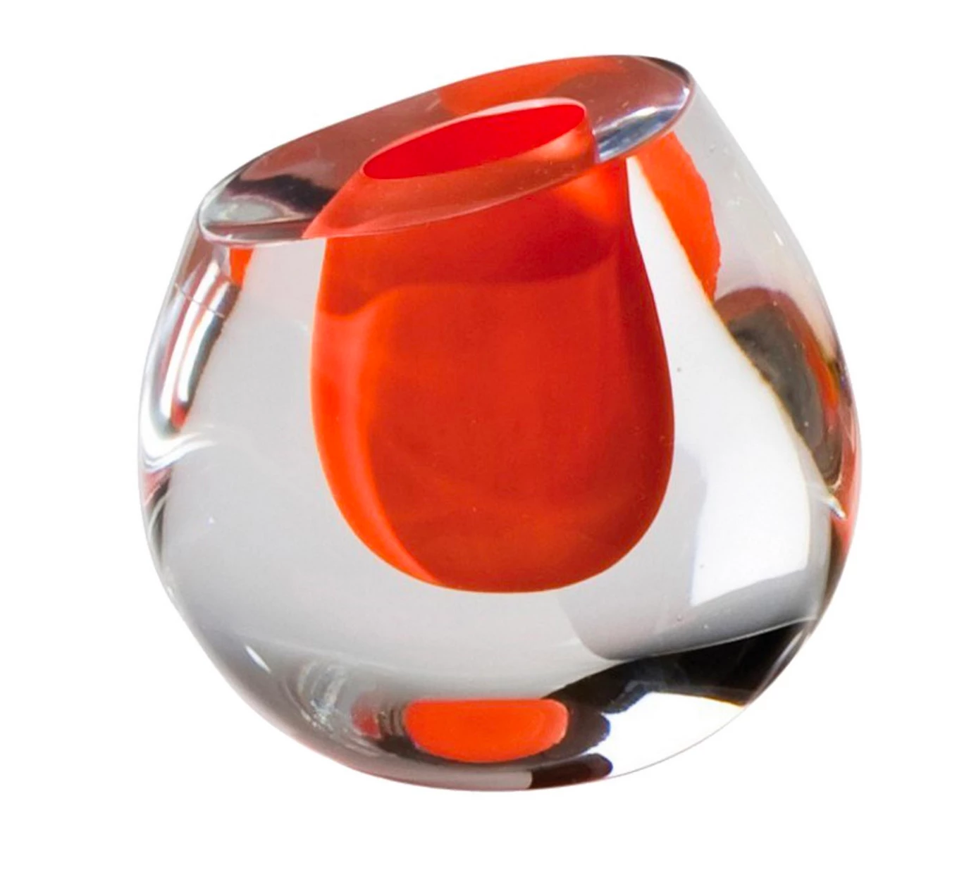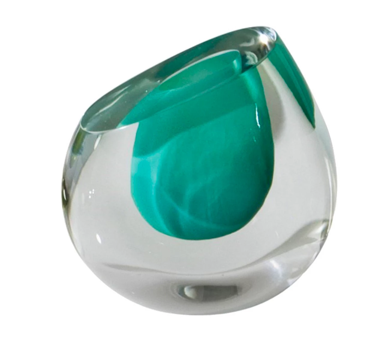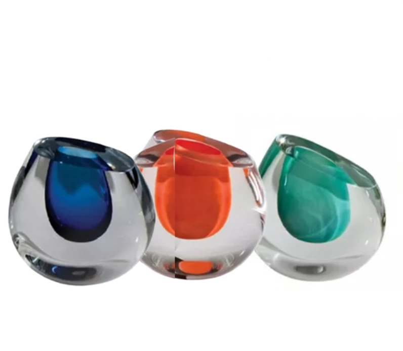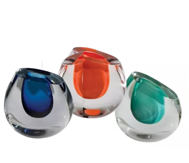 The color drop vases are hand blown art glass made by artisans in Poland. Each solid clear jewel like vase has an interior cased in one of 5 different rich colors of glass.