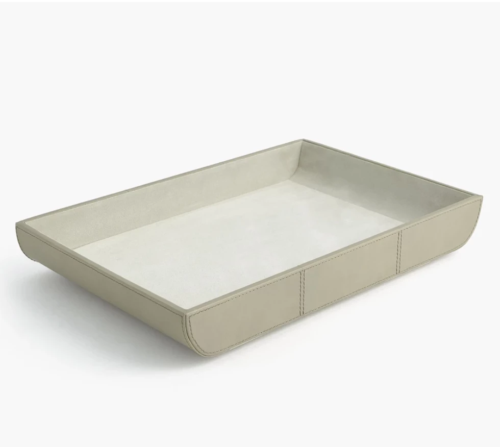 Ivory cowhide leather is used on our Curved Corner Tray. Beautiful stitching creates the simple yet sophisticated design of the tray. Lined with matching suede cloth facbric.