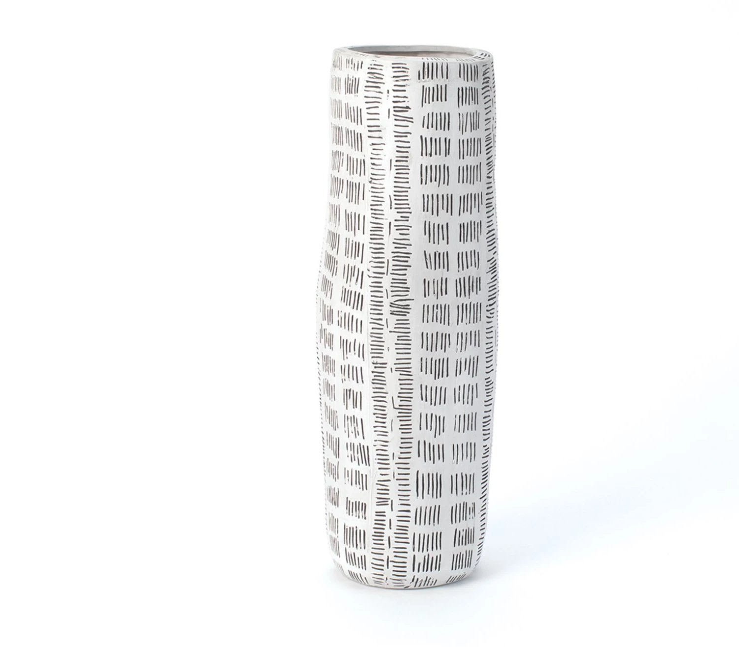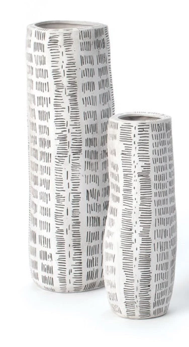 THE QUENCY VASES HAVE AN AFRICAN INSPIRED DESIGN CARVED INTO THE CERAMIC, WHICH ARE GLAZED AND WASHED TO CREATE THE CONTRACT BETWEEN THE PATTERN AND THE BODY. HANDMADE IN ITALY.