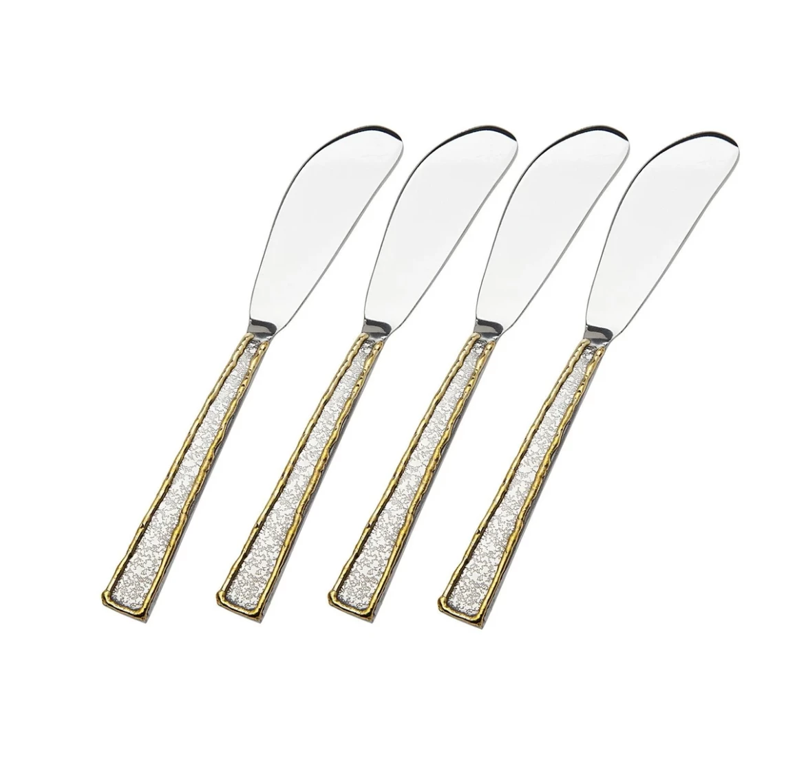 The Golden FrostĀ SpreaderĀ set includes 4 pieces and is perfectĀ for cheese , snacksĀ and dips. We love theĀ sophisticated mix of metal on the matte silver plated finish.Ā