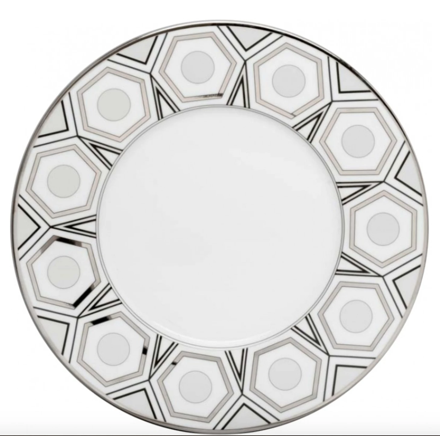 It is crafted from Limoges porcelain in a larger size that is ideal to use as a serving platter or as a presentation plate with other dinnerware. Stunning abstract geometric detailing covers its crisp white surface in black and silver color, forming a bold contrast that will stand out against any dining table.