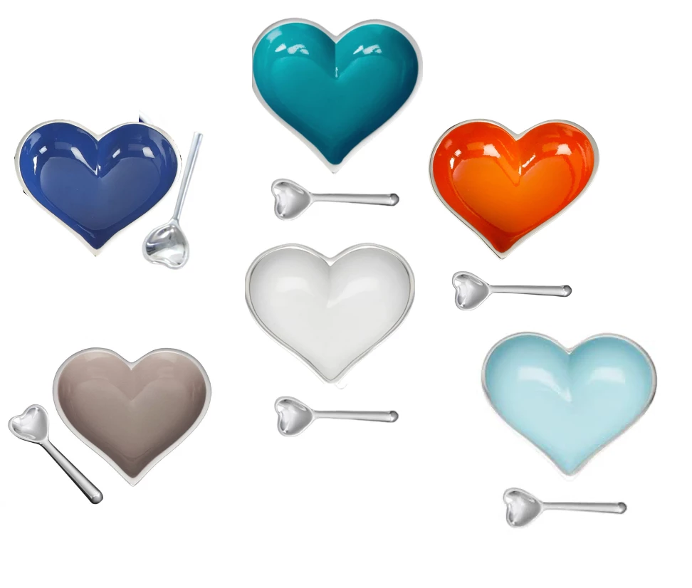 The Happy hearts bowls will fill everyone up with love and yummy candies, nuts & dips…or use it as a colorful catchall for jewelry & other small items. A shiny Lil Heart Spoon comes with every dish.Â