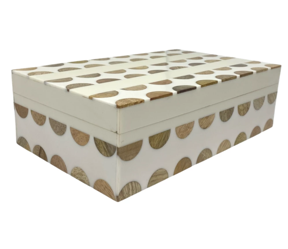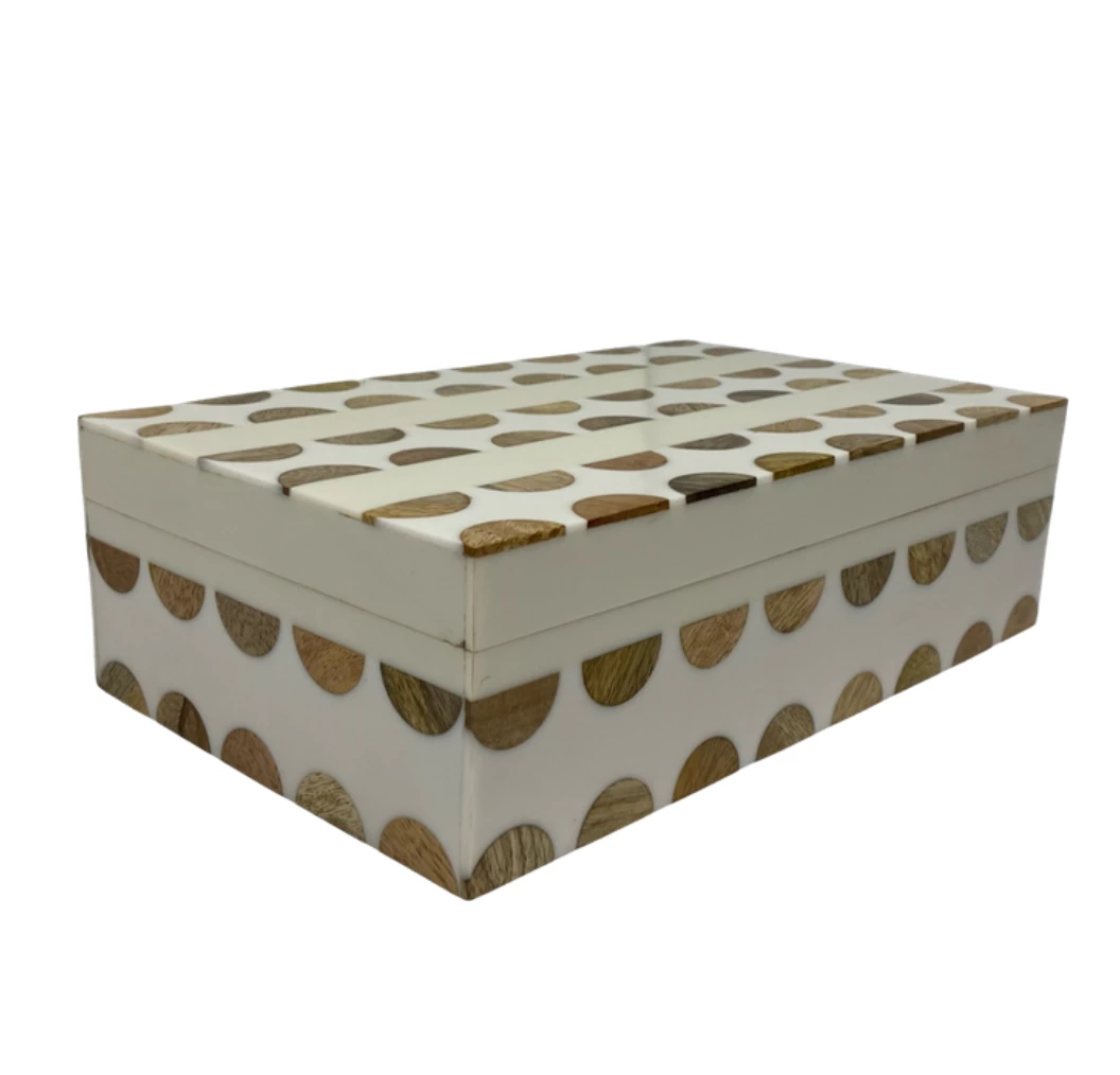The handmade box is produced by master craftsman in a mix of ivory resin, and inlaid wood details.