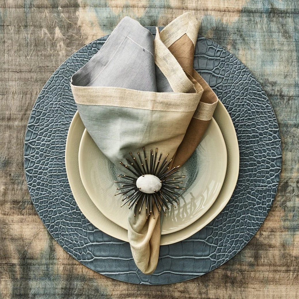 The round embossed faux Croco Placemats are the perfect staple. The organic yet sophisticated crocodile pattern in Cadet works in any season. They are easy to care for; simply wipe down before storing.