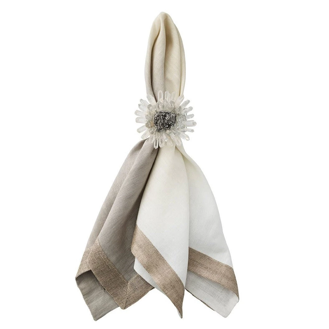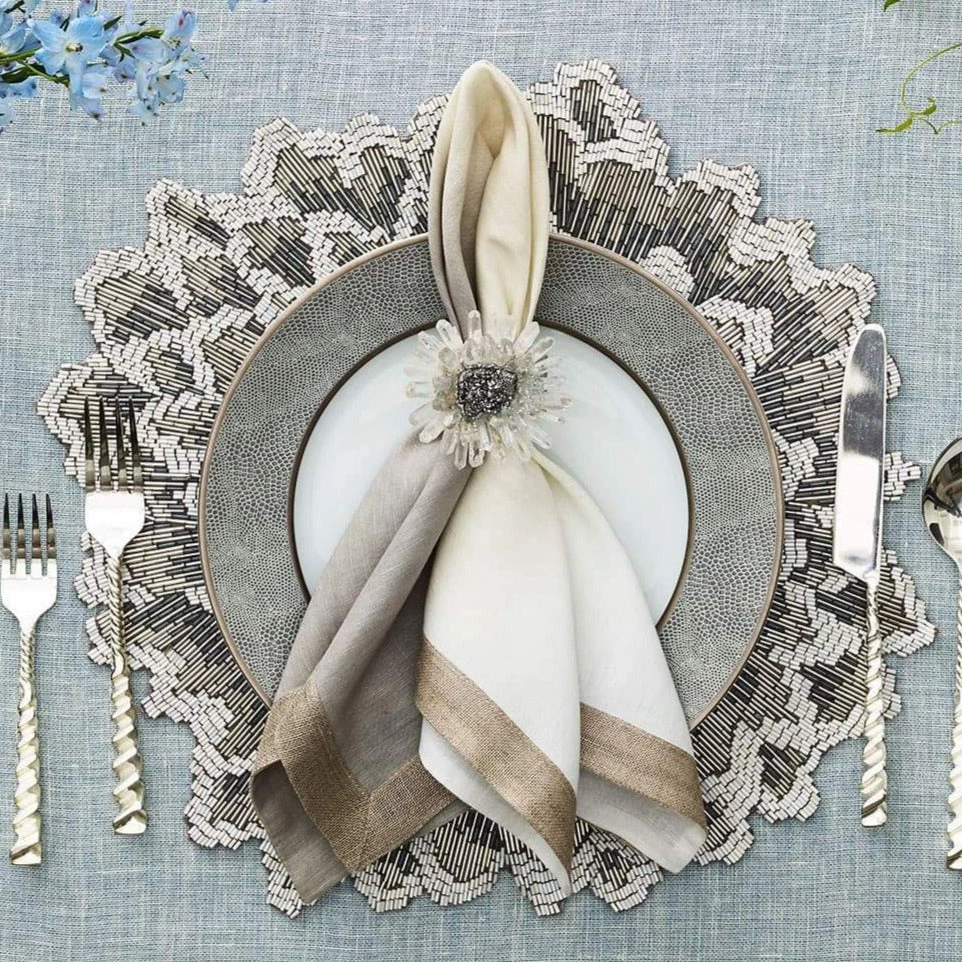 The linen Dip Dye Napkin features an ombre gradation in silver and gray tones, adding a subtle elegance to the refined linen napkin. This muted yet gorgeous color combination complements any festive table. These linen napkins are hand dipped and dyed and accented with a luxurious metallic foil border.