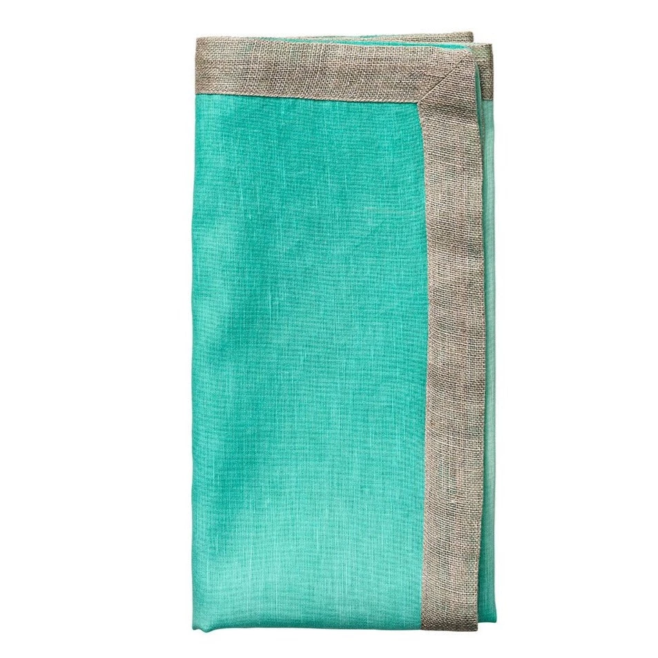 The new version of Kim Seybert’s ombre Dip Dye Napkins in mint and silver adds a subtle elegance to the linen napkin. They are hand dipped and dyed and accented with a metallic foil facing.