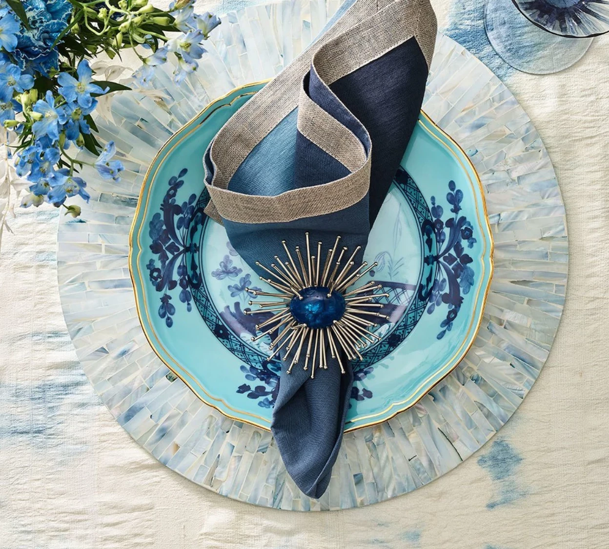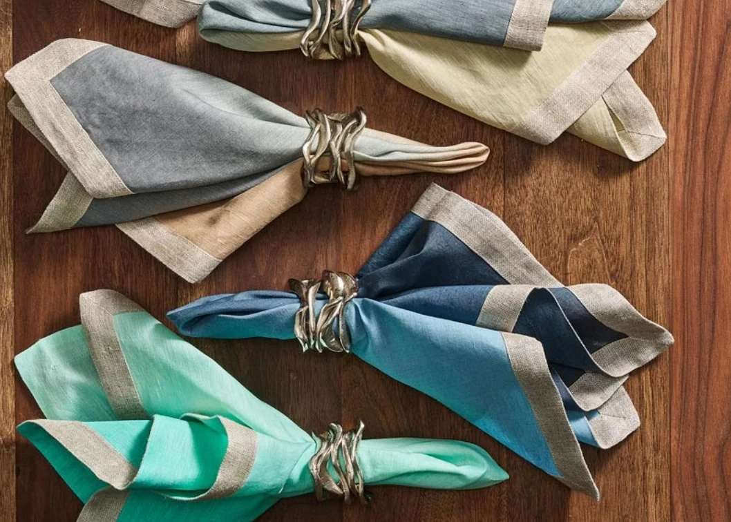 Nothing says summer more than our beautiful ombre Dip Dye Napkin in navy and blue. They are hand dipped and dyed, accented with a metallic foil facing edge that makes them casually sophisticated.Â