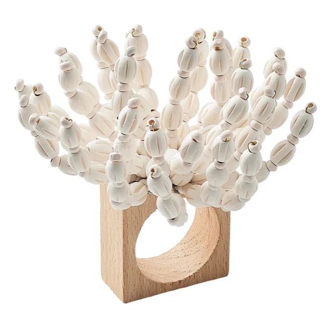 The hand-made, wooden beaded Reed Napkin Ring is the perfect addition to any Summer table setting. Wooden beads are hand-arranged in a sea-inspired spray and sit atop a wooden square base.