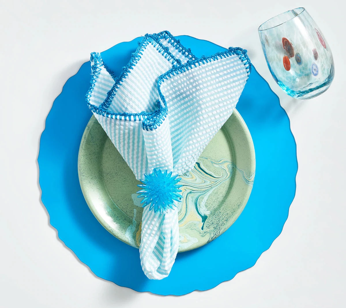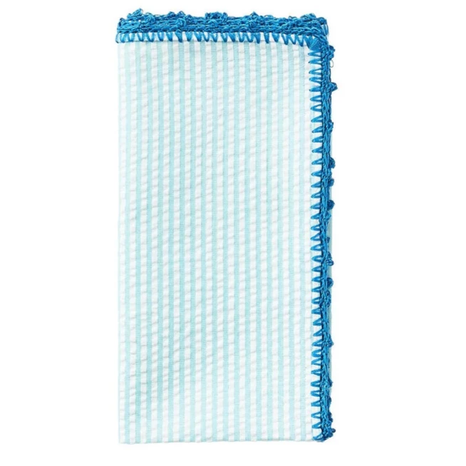 The cotton Seersucker Napkin is the perfect summertime entertaining staple. Featuring a slack-tension weave results in a crinkled cotton fabric with a puckered look. The pretty seafoam striped cotton napkin features a contrasting bright blue, hand-crocheted edge. The napkin is wrinkled by nature which allows for easy care.