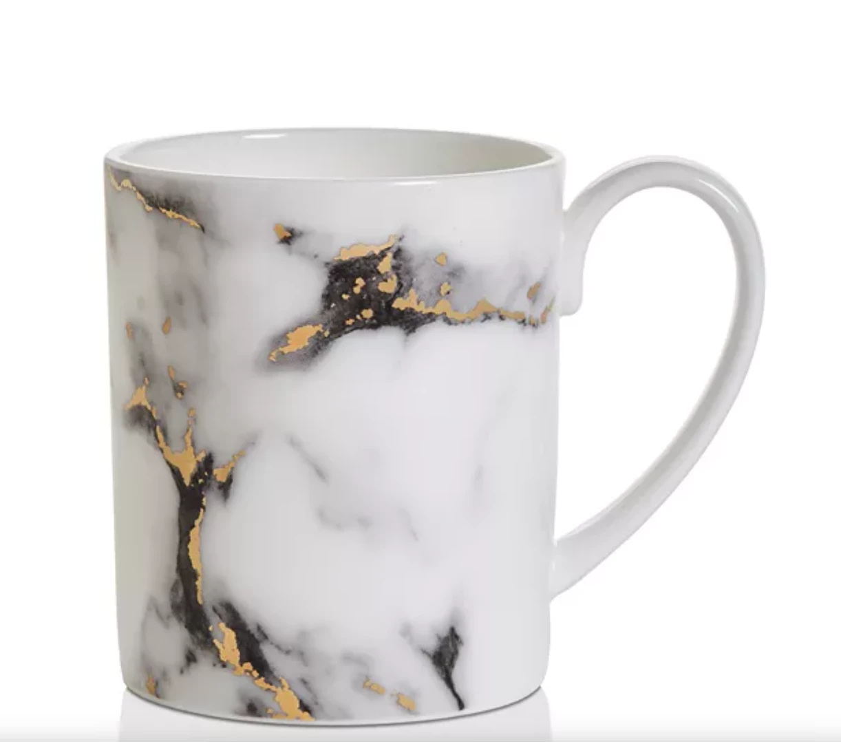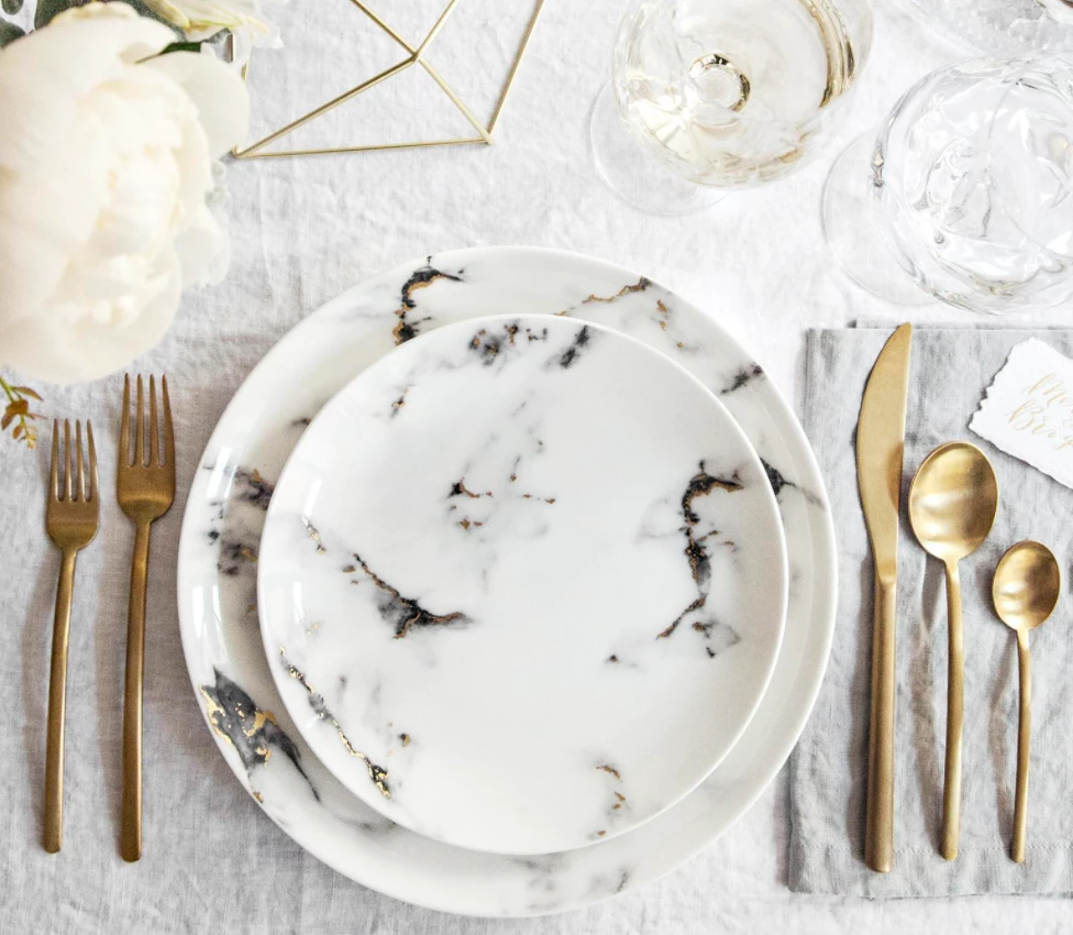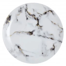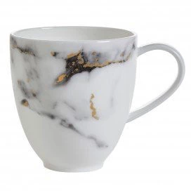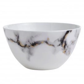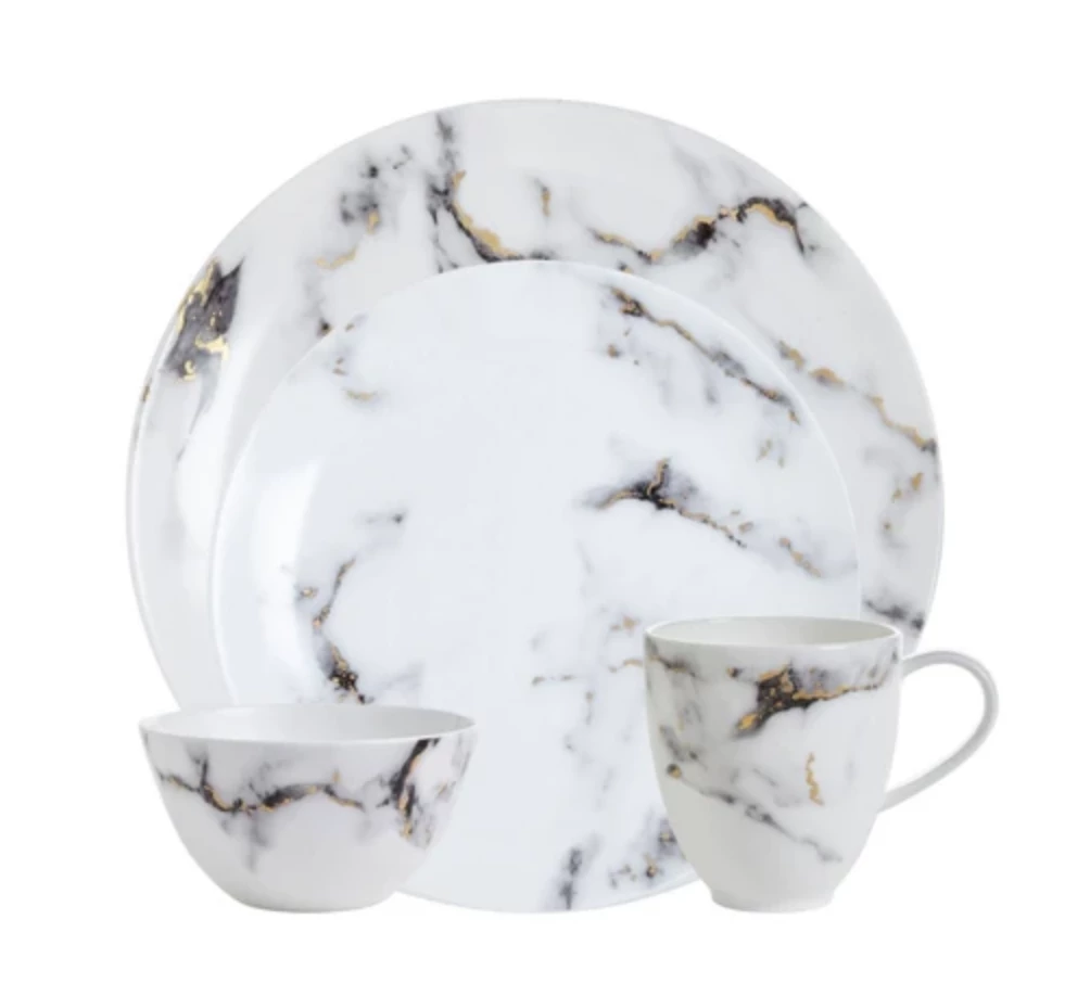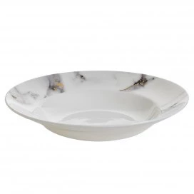 A modern design with a mottled grey marbelized look that is accented with 24k gold detailing throughout. The high quality bone china is durable and dishwasher safe using a non citrus detergent. Not able to be used in the microwave. Additional serving pieces are available. Call for details!