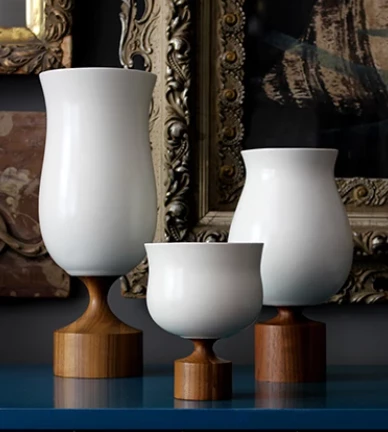 Walnut and porcelain come together to create this elemental beauty. The Gordon vase is is hand-made and hand-glazed, high-fired to over 2150ºF. The hand-turned walnut meets FSC guidelines and is harvested from low-risk forests. Â