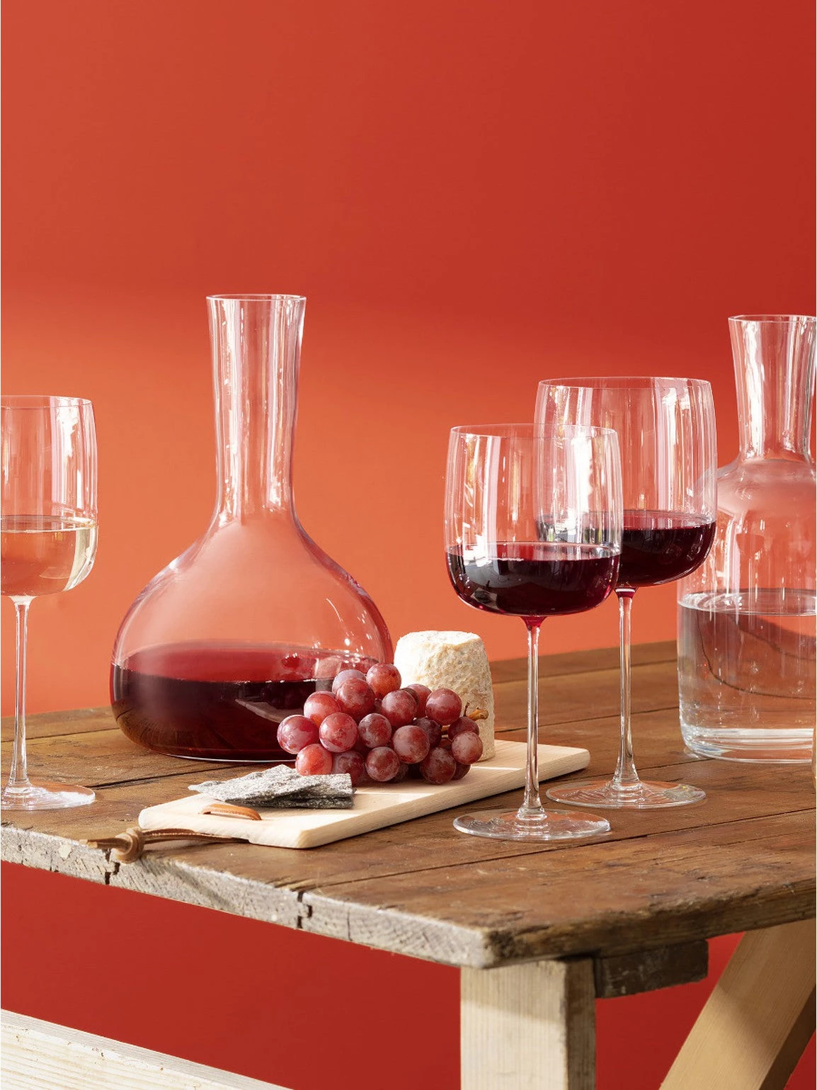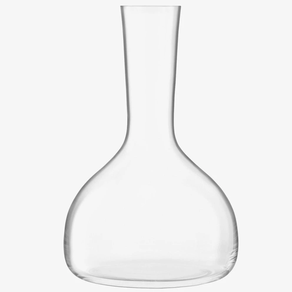 A mouth-blown wine carafe with curved body and flared neck. The wide base allows greater surface area for wine to breathe.