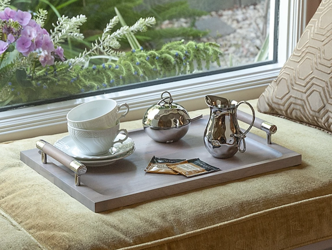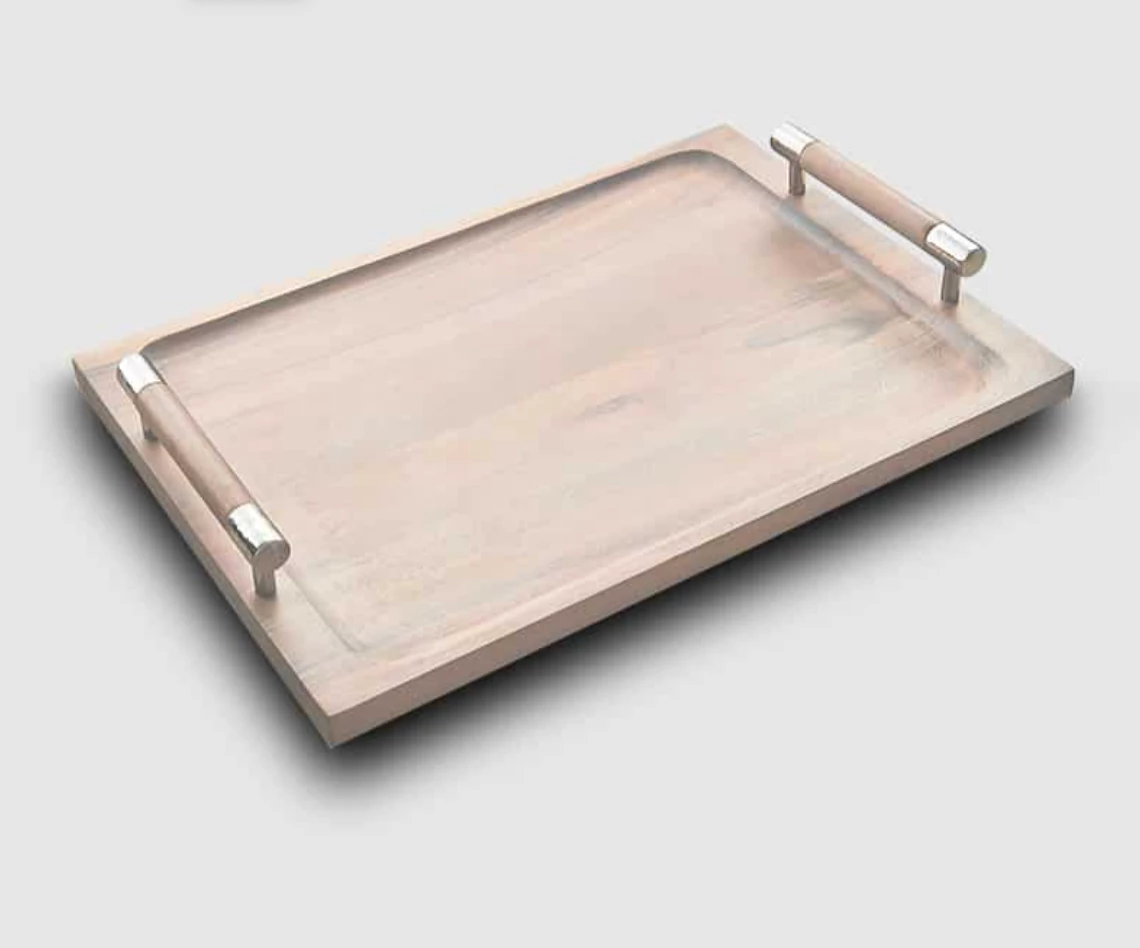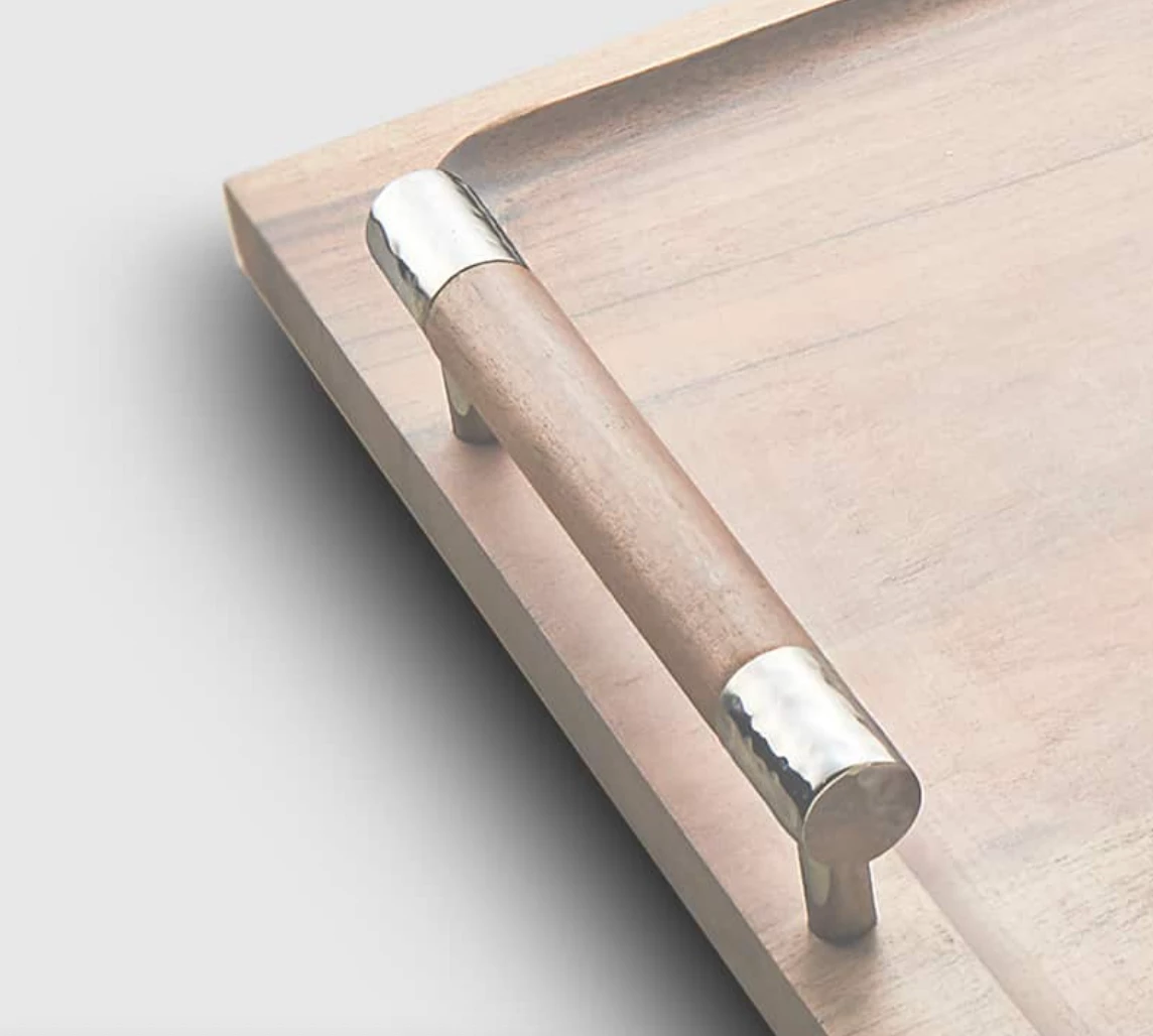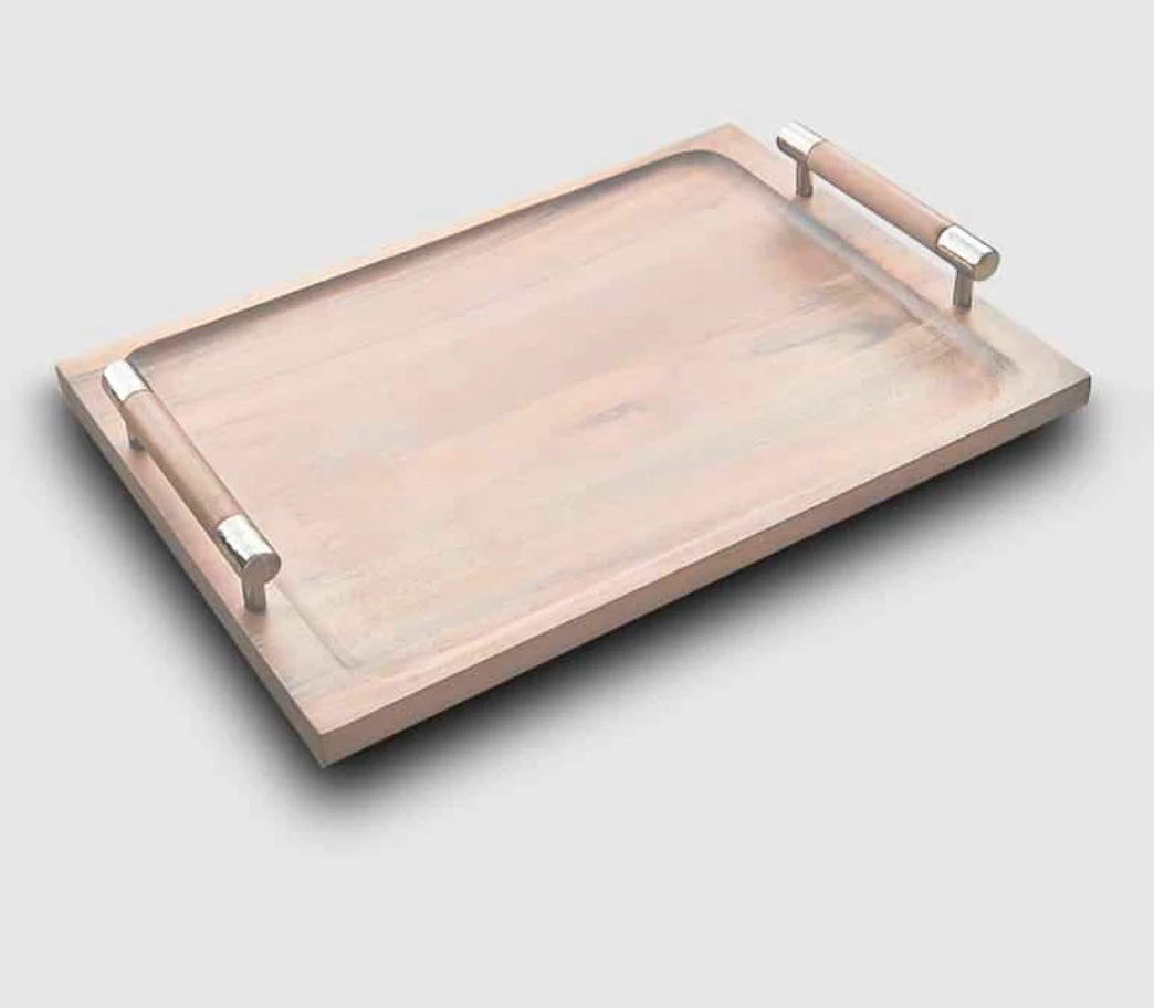 Our Sierra contemporary wood serving tray with stainless steel accented handles is as comfortable in the bar as it is working with other home accessories; not relying completely on its good looks, you will feel just as comfortable serving cheese and mimosas as you would breakfast in bed. Makes a beautiful piece of serveware on any table or style setting, be it modern, traditional, or informal.