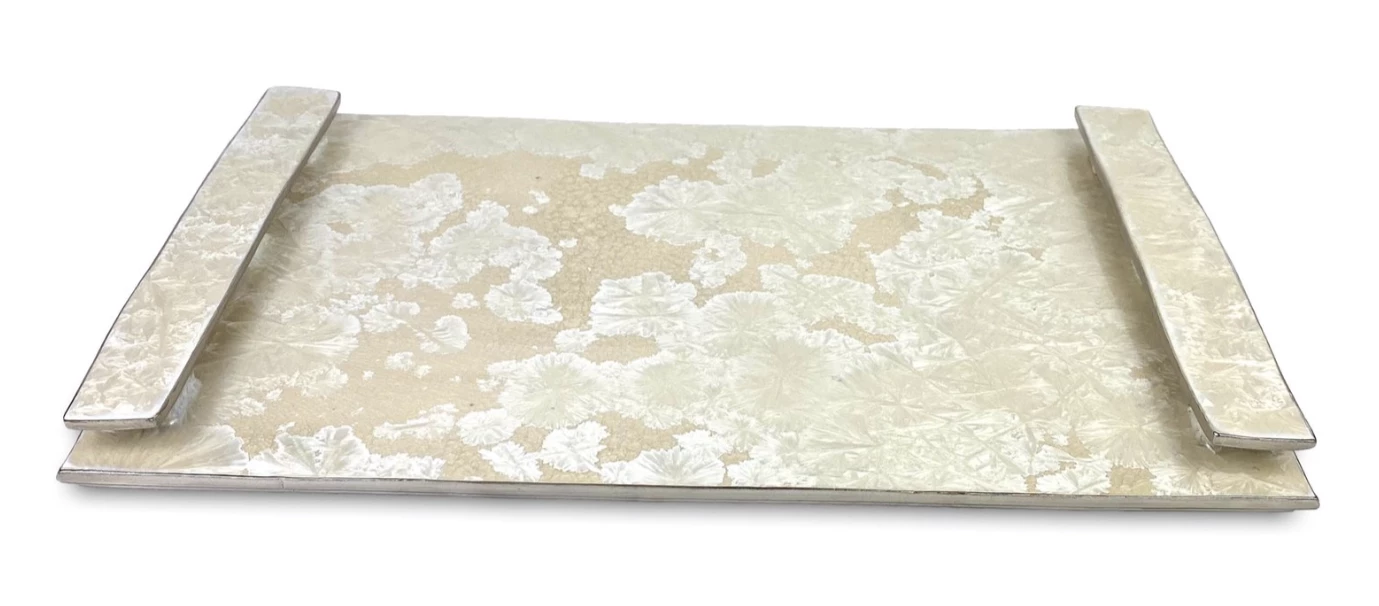 The Borealis Tray is made of clay with a very cool crystal glaze, finished in 24K Platinum and handmade in the USA. Perfect as a cheese tray for serving starters or as decor, this tray is sure to attract attention. Food Safe, with a durable finish that is safe to cut on.Â
