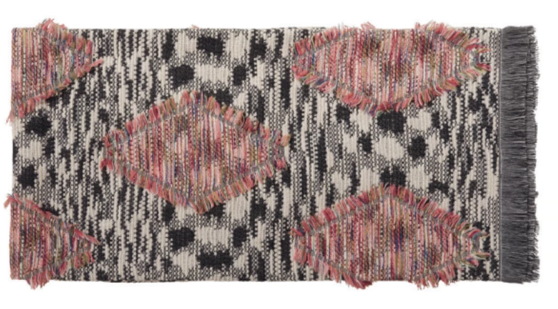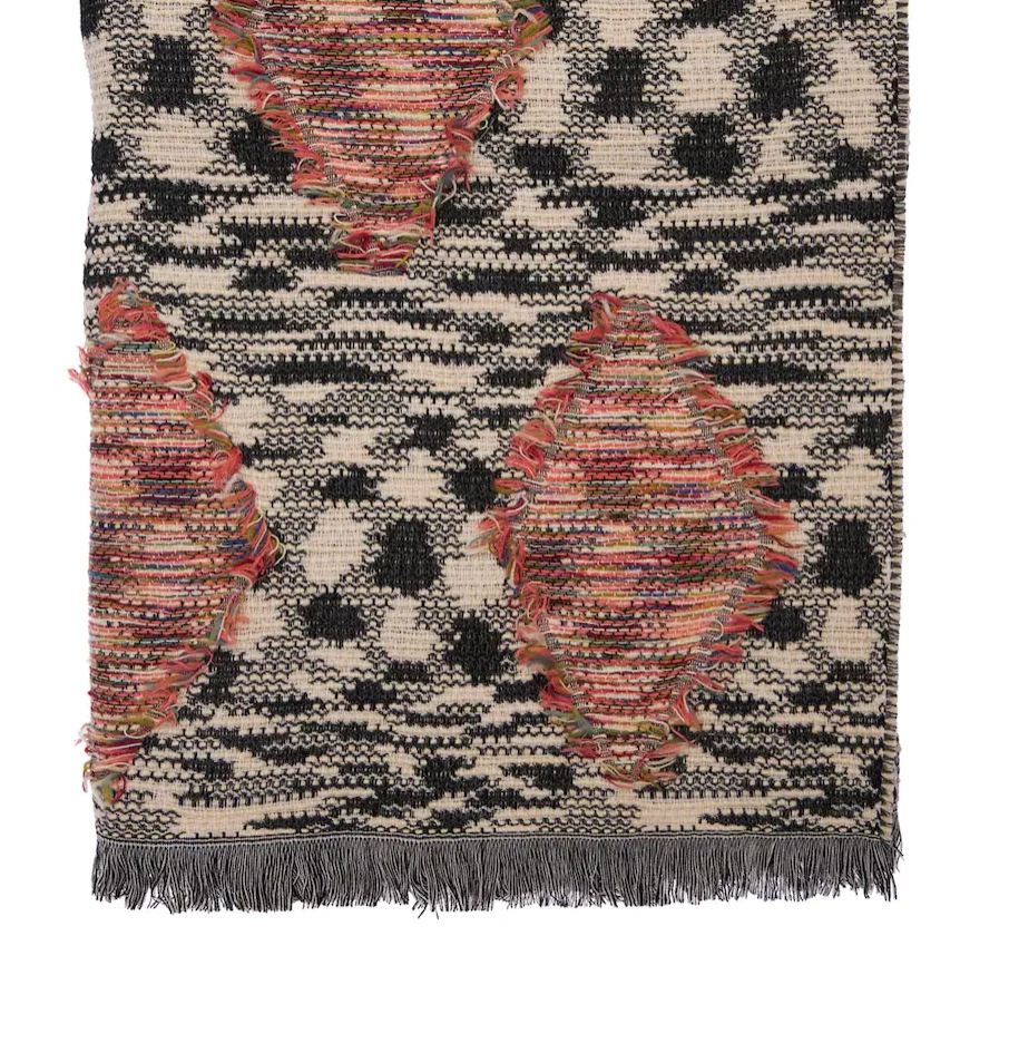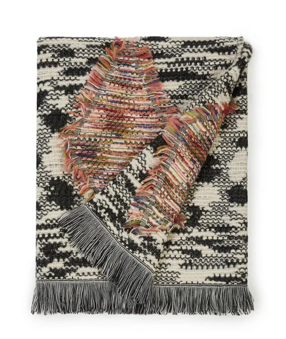 This is our new favorite! The black and white woven throw is soft and comfortable. The patches of beautifully woven colors have fringe edges and are scattered throughout the throw. Made in Italy