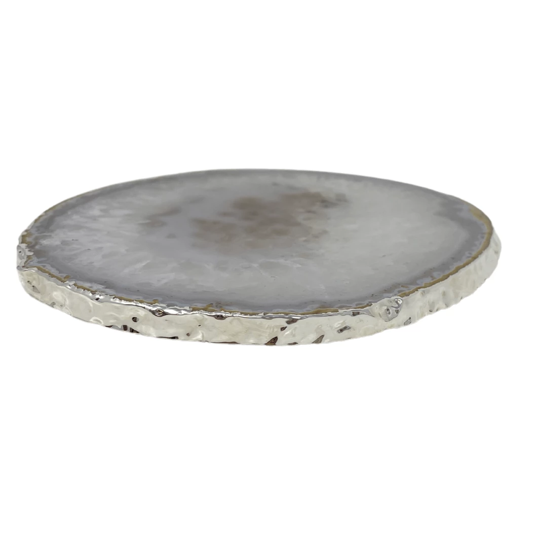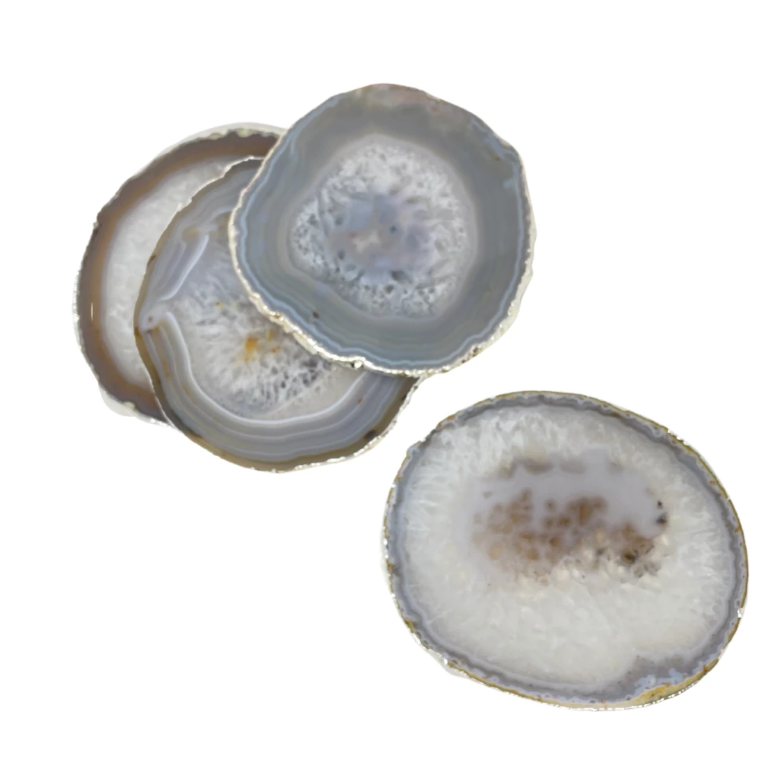 A Current Home Favorite! Bring one of a kind beauty to your coffee table or desk with these glamorous agate coasters with a pretty silver trim detail.