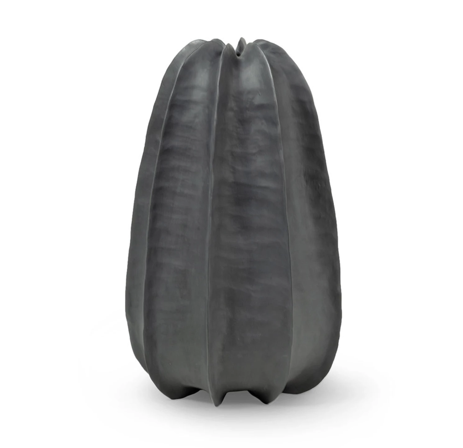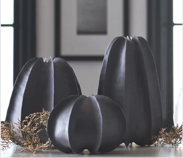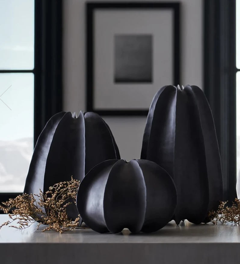 These porcelain vases are have a matte charcoal finish and look beautiful together or alone. The durable porcelain is a form of ceramic made from clay and other minerals, fired at high temperatures to produce a vitreous fine-grained body with a rich look.