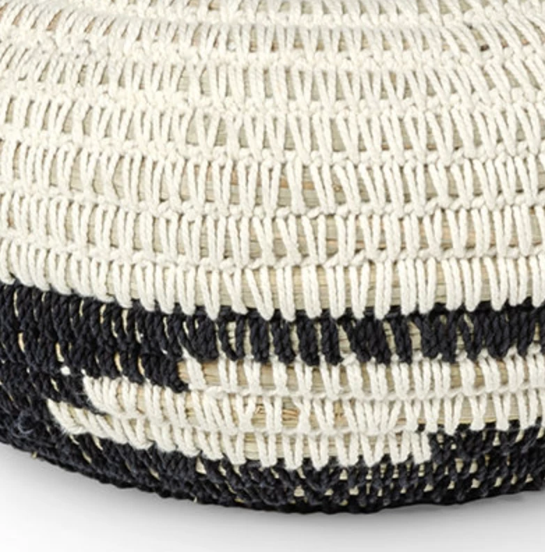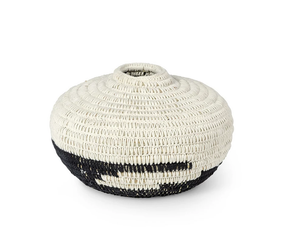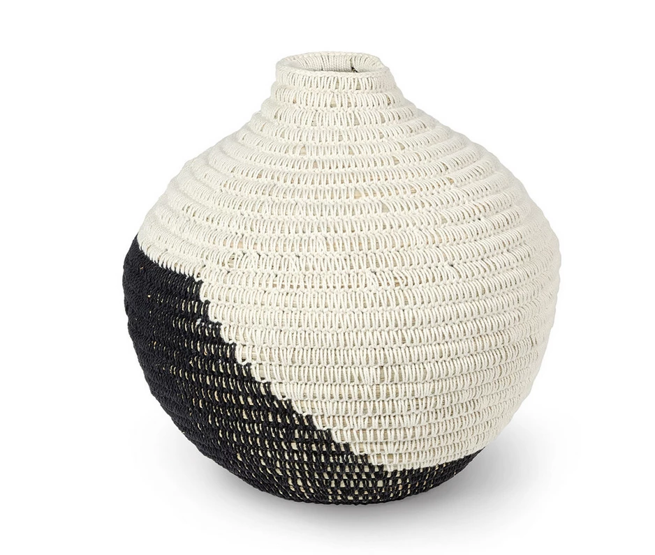 These dramatic urns feature hand-wrapped white and black cotton over a natural seagrass frame. They have a relaxed look that with beautiful craftsmanship.